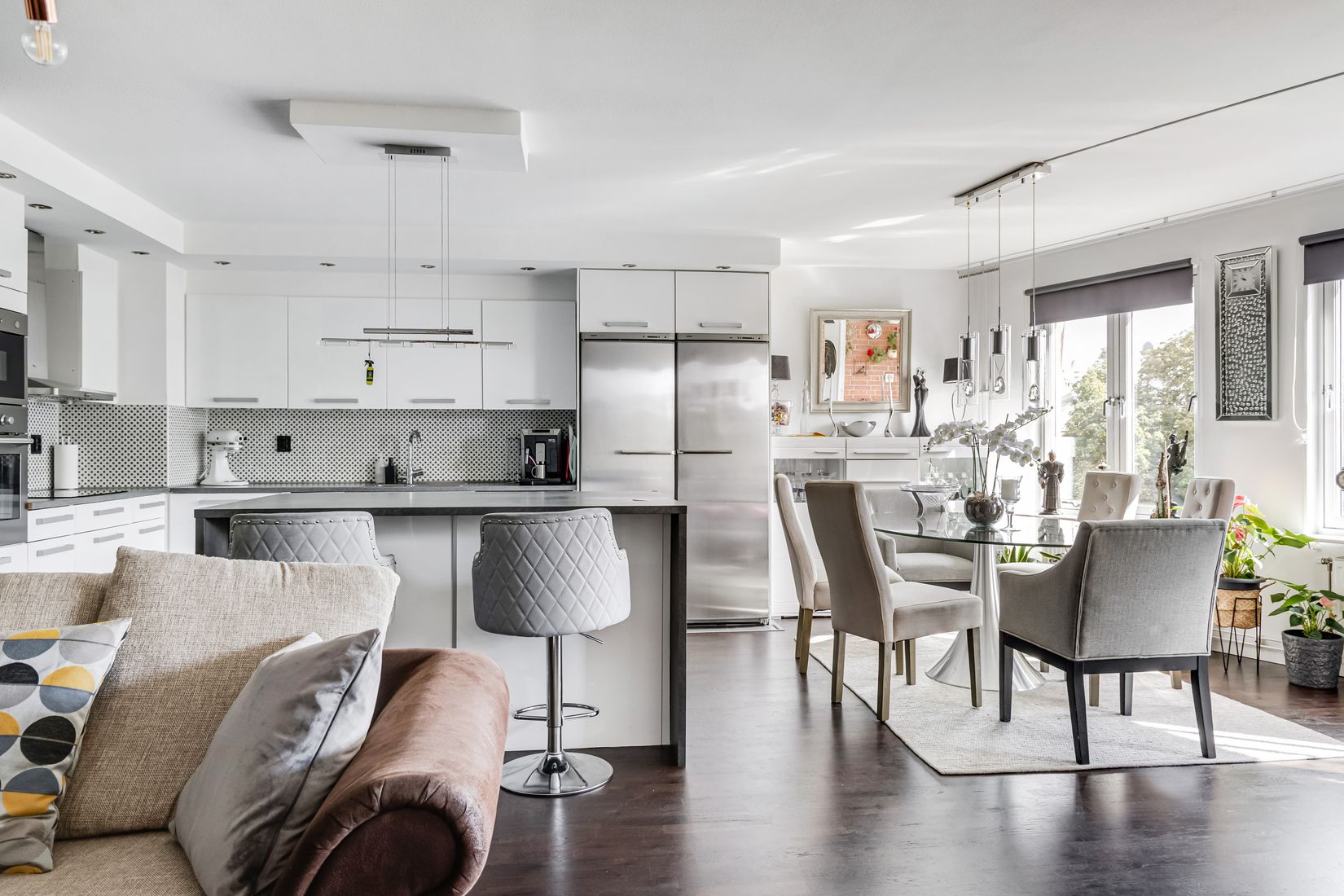 Bostadens hjärta är det luftiga vardagsrummet som i öppen planlösning möter köket. Här binder en stilfull köksö samman rummen och skapar en social yta med gott om plats för både stora soffgrupper och matbord. Köket är modernt inrett i högblankt vitt med rostfria vitvaror och från vardagsrummet nås den inglasade balkongen i soligt söderläge med utsikt mot Stadshuset – en perfekt plats för avkoppling året runt.