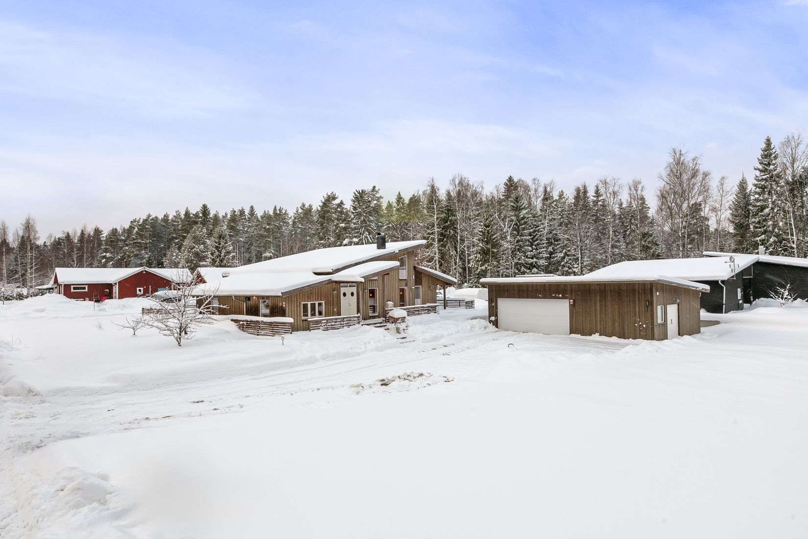 På den stora tomten finns ett nybyggt arkitektritat dubbelgarage om ca 70 kvm med elport och egen luftvärmepump - perfekt för både bilentusiasten och den som vill ha extra förvaring. Här finns också gott om plats för lek, odling eller trädgårdsprojekt.