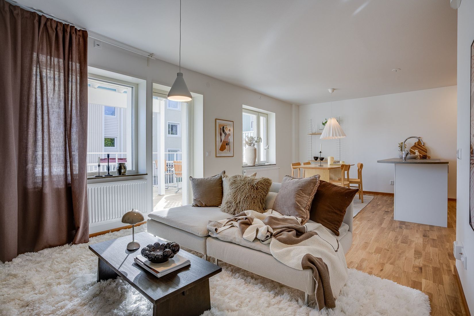 Du kan bli den första att flytta in i denna nyproducerade och påkostade tvåa med superfin social planlösning och en 18 kvadrats solig terrass. Kök, matplats och vardagsrum är i öppen planlösning, där en välutrustad arbetsbänk/bardisk gör matlagningen till en social aktivitet. Vid denna disk kan du nämligen skölja grönsaker och laga mat på häll/ugn medan du umgås med familj och vänner. I övrigt har köket dubbla hoar och påkostade vitvaror. I lägenheten, som förresten är handikappanpassad, är det även bra förvaring via garderober, klädkammare samt förråd. Här får du det bästa av världar - en sprillans ny och riktigt fin lägenhet, med den äldre och stabilare föreningens låga skuldsättning och goda ekonomi. I månadsavgiften ingår t ex alla kostnader, inklusive kabel-tv, internet och hushållsel. Varmt välkommen hit på visning och få känna in detta fina boende med centralt läge i Umeå!