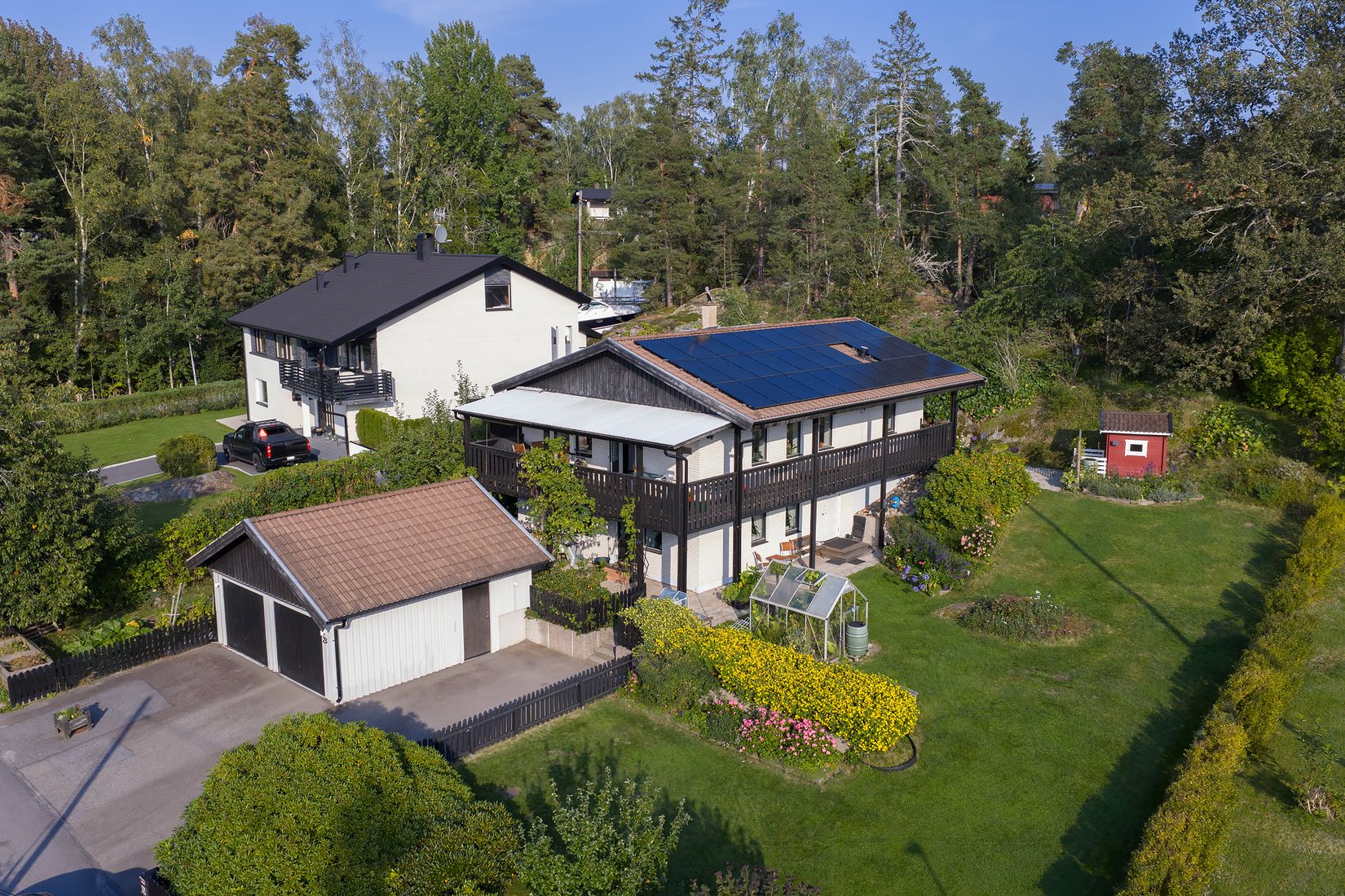Huset är utrustat med solceller, FTX-ventilation och frånluftsvärmepump med vattenburen värme - både pålitligt och kostnadseffektivt.