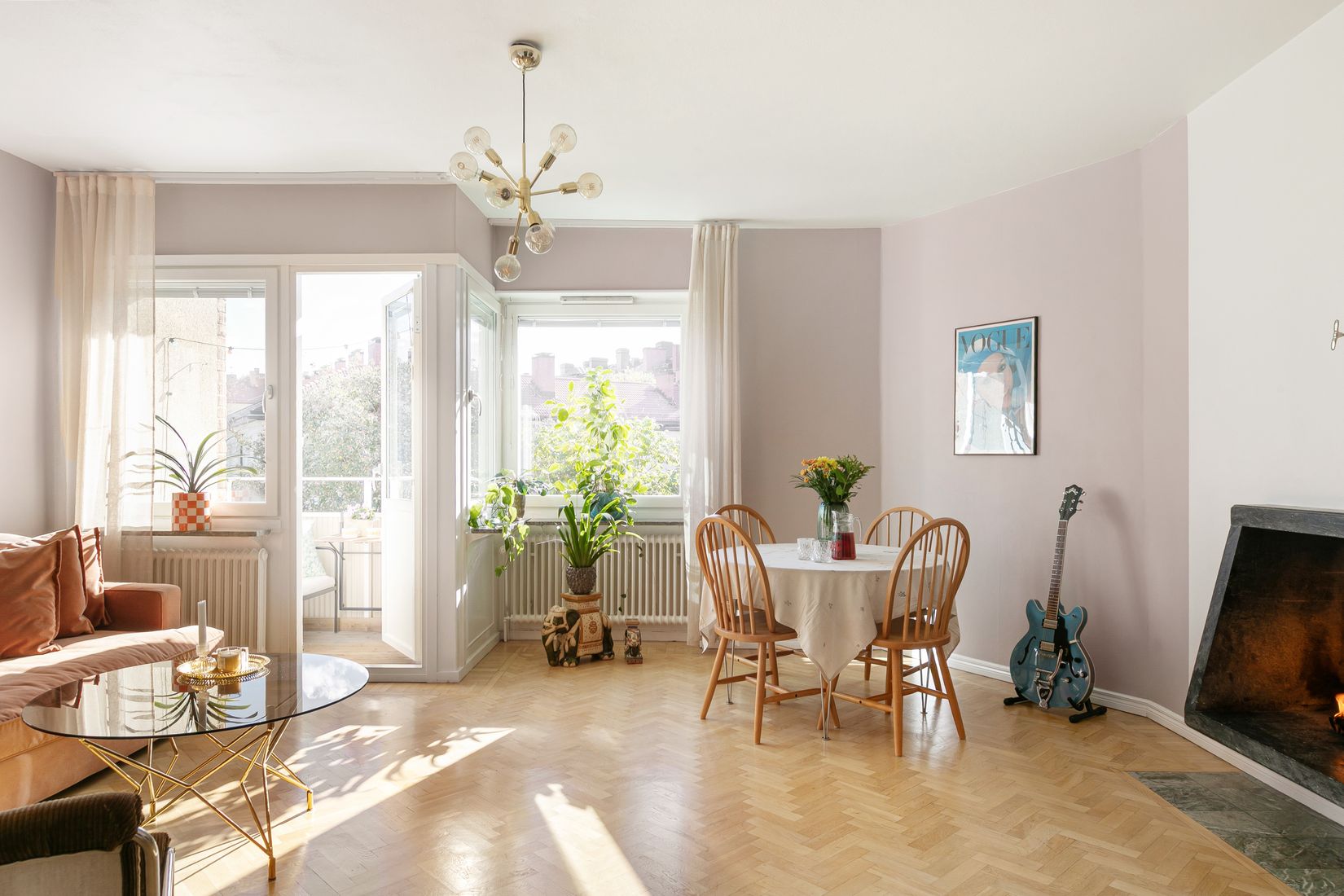 Lägenheten präglas av en luftig planlösning som skapar härliga sociala ytor och har ett fantastiskt ljusinsläpp som flödar genom bostaden. Det rymliga vardagsrummet ger gott om plats för både soff- och matgrupp, här möts du av vacker fiskbensparkett samt en öppenspis som förhöjer mysfaktorn. Från vardagsrummet hittar du dessutom utgången till balkongen i perfekt solläge med utsikt mot föreningens grönskande innergård.