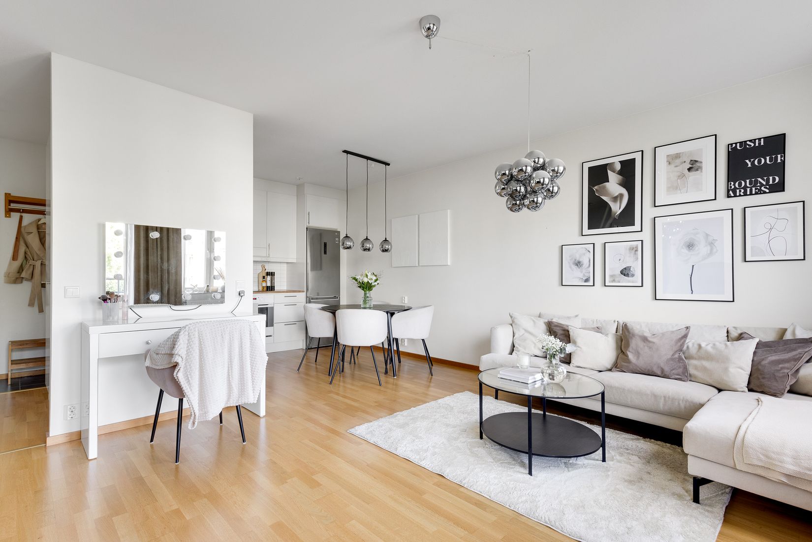 Bostaden präglas av smakfulla materialval och genomtänkta lösningar. Den öppna planlösningen mellan kök och vardagsrum skapar en social yta med gott om ljus och rymd. Köket är fullt utrustat och här finns allt du behöver för att laga mat och umgås. Sovrummet har en modern, mörk färgsättning och en generös garderobsvägg som ger utmärkt förvaring. Det helkaklade badrummet är fräscht och stilrent och utrustat med både tvättmaskin och torktumlare – en bekväm lösning för vardagen.