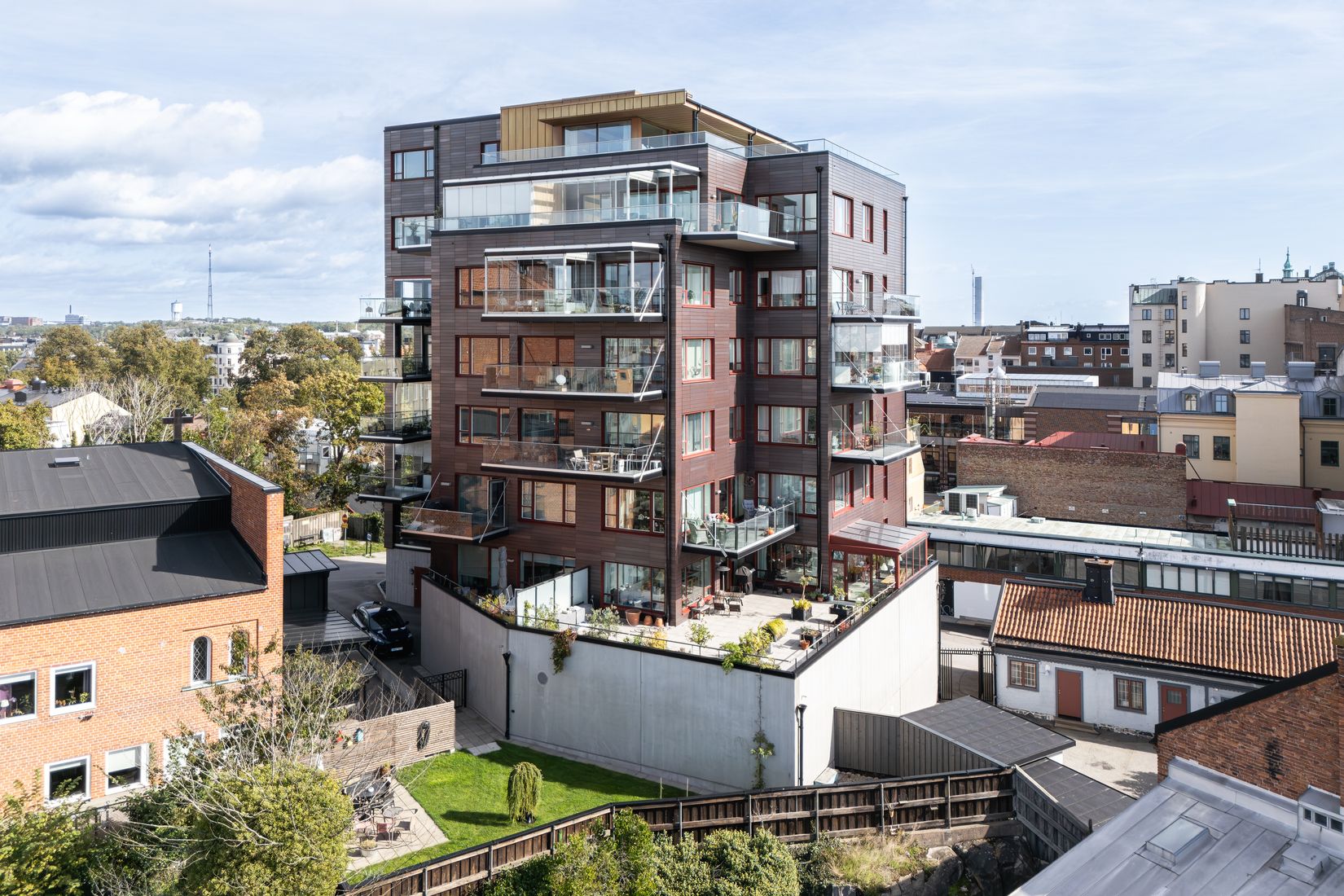 Bostaden erbjuder utöver de sociala ytorna två rymliga sovrum, ett stort helkaklat badrum samt ett praktiskt gästbadrum med exklusiv känsla. Genomgående möts du av generös takhöjd och en öppen känsla som tillsammans med fönstrens ljusinsläpp ger ett hem som upplevs både ljust och välkomnande.