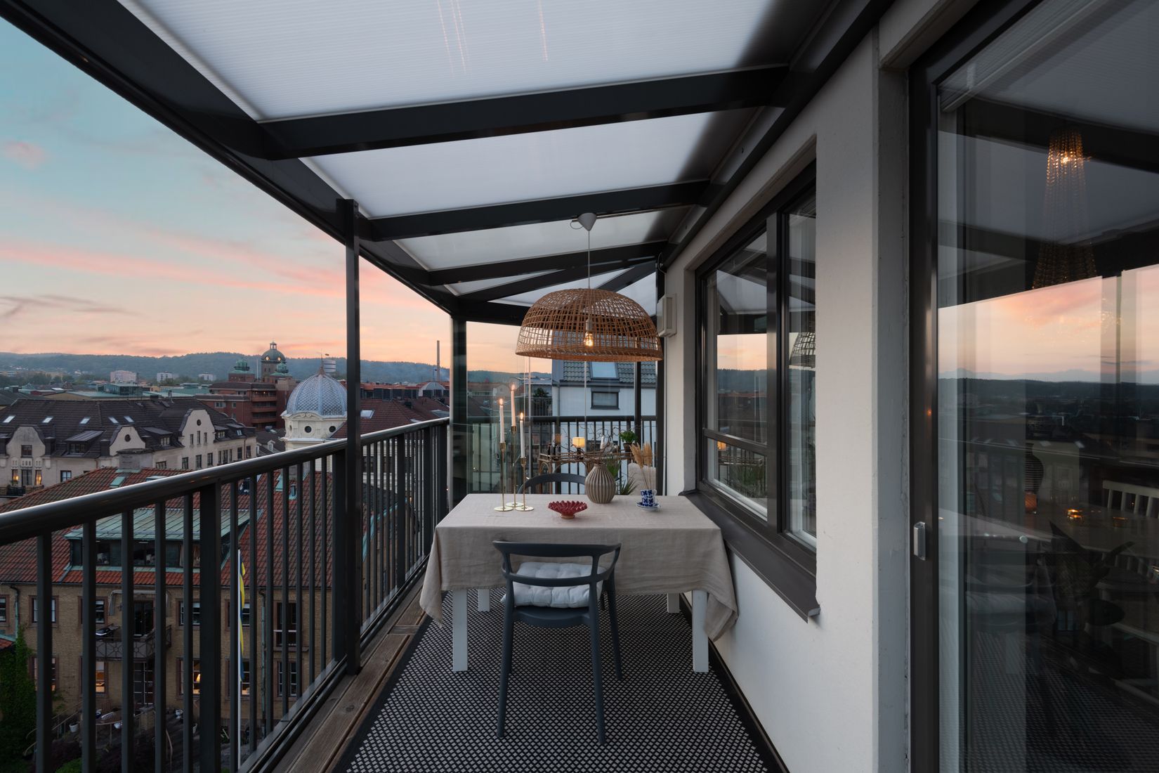 Med ett exklusivt läge högst upp i huset, på sjätte våningen, presenteras denna unika bostad på en av Borås mest eftertraktade adresser. Här möts du av en imponerande takhöjd om upp till 4,70 meter och en utsikt över stadens takåsar som ger en känsla av att bo ovan molnen. Fönster i tre väderstreck fyller hemmet med ljus och förstärker den redan storslagna atmosfären. De 103 kvadratmetrarna är fördelade med en exceptionell känsla för rymd och funktion. Hjärtat av hemmet utgörs av den öppna sociala ytan där kök, matsal och vardagsrum samspelar på ett självklart sätt – perfekt för både representation och avkoppling. Den inglasade balkongen förlänger bostaden och erbjuder en privat plats att njuta av årets alla dagar. Planlösningen rymmer tre rymliga sovrum, placerade på ett sätt som skapar både integritet och flexibilitet. Master bedroom ligger avskilt från de övriga, med gott om plats för förvaring, medan de två andra sovrummen enkelt kan anpassas till barnrum, arbetsrum eller gästrum. Här skapas en fin balans mellan socialt liv och privata utrymmen. Utöver det helkaklade badrummet med tvättmaskin och torktumlare finns även en gäst-wc med dusch – en eftertraktad bekvämlighet som underlättar vardagen. Genomgående återfinns väl avvägda materialval och detaljer som tillsammans formar en helhet av högsta klass. Bostaden erbjuder dessutom goda förvaringsmöjligheter, inklusive klädkammare och tillhörande källarförråd.