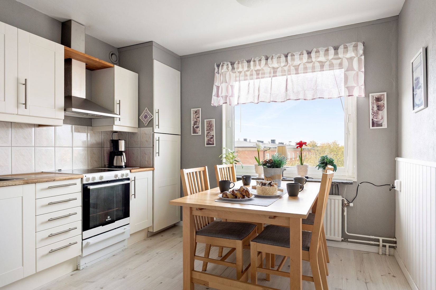 Det stilrena köket från 2013 går i vitt med träbänkskivor och har plats för matbord intill fönstret. Utrustningen består av kyl/frys (2018), spis (2018), och fläkt (2017) – allt för att vardagen ska flyta smidigt.
