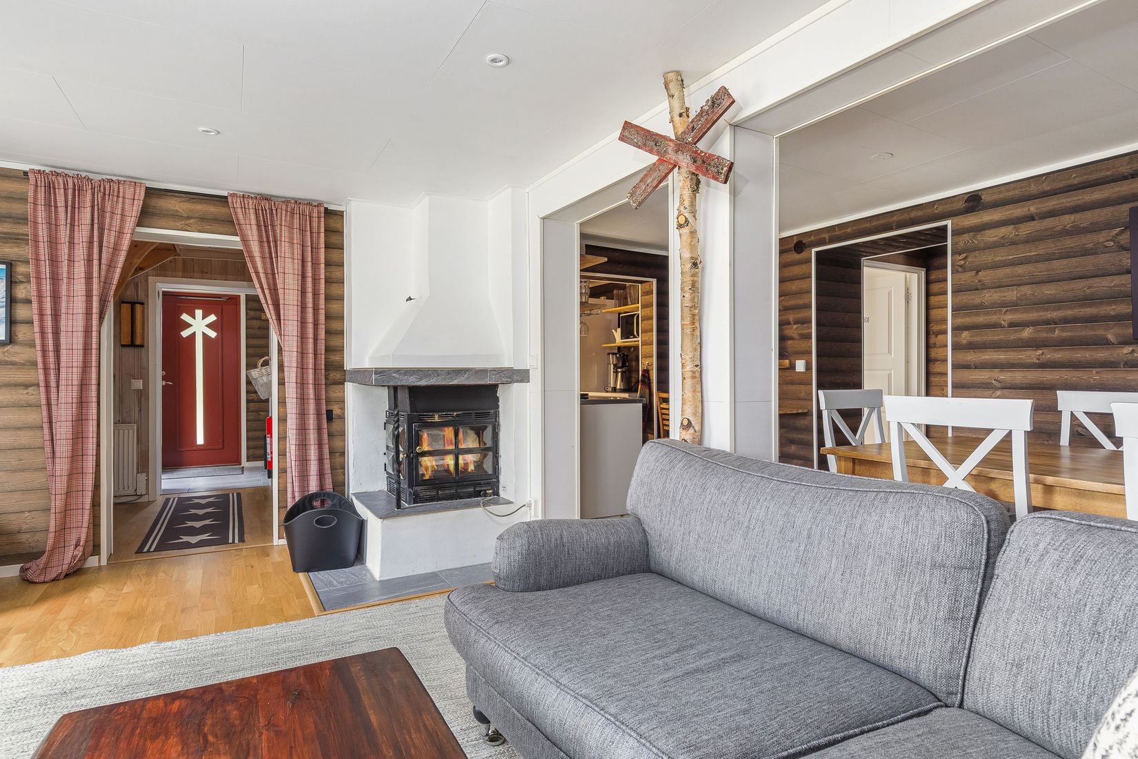 Här kan du njuta av den mysiga storstugan med en braskamin som sprider värme och gemytlighet. Det fullt utrustade köket inbjuder till kulinariska upplevelser i goda vänners lag. Efter en aktiv dag på fjället erbjuder den avkopplande bastun och det helkaklade badrummet en välförtjänt vila, med direkt utgång till uteplatsen där du kan svalka av dig i snön, om du vågar!
