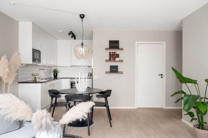 Vardagsrummet och köket binds samman i en öppen planlösning som inbjuder till gemenskap. Här skapas naturliga ytor för umgänge, matlagning och vila. De enhetliga golven, de rostfria vitvarorna och den mörka laminerade bänkskivan bryter av mot kökets ljusa uttryck och tillför både kontrast och karaktär. Intrycket förstärks av väl utvalda detaljer och gedigna innerdörrar som ger bostaden en känsla av kvalitet och harmoni.