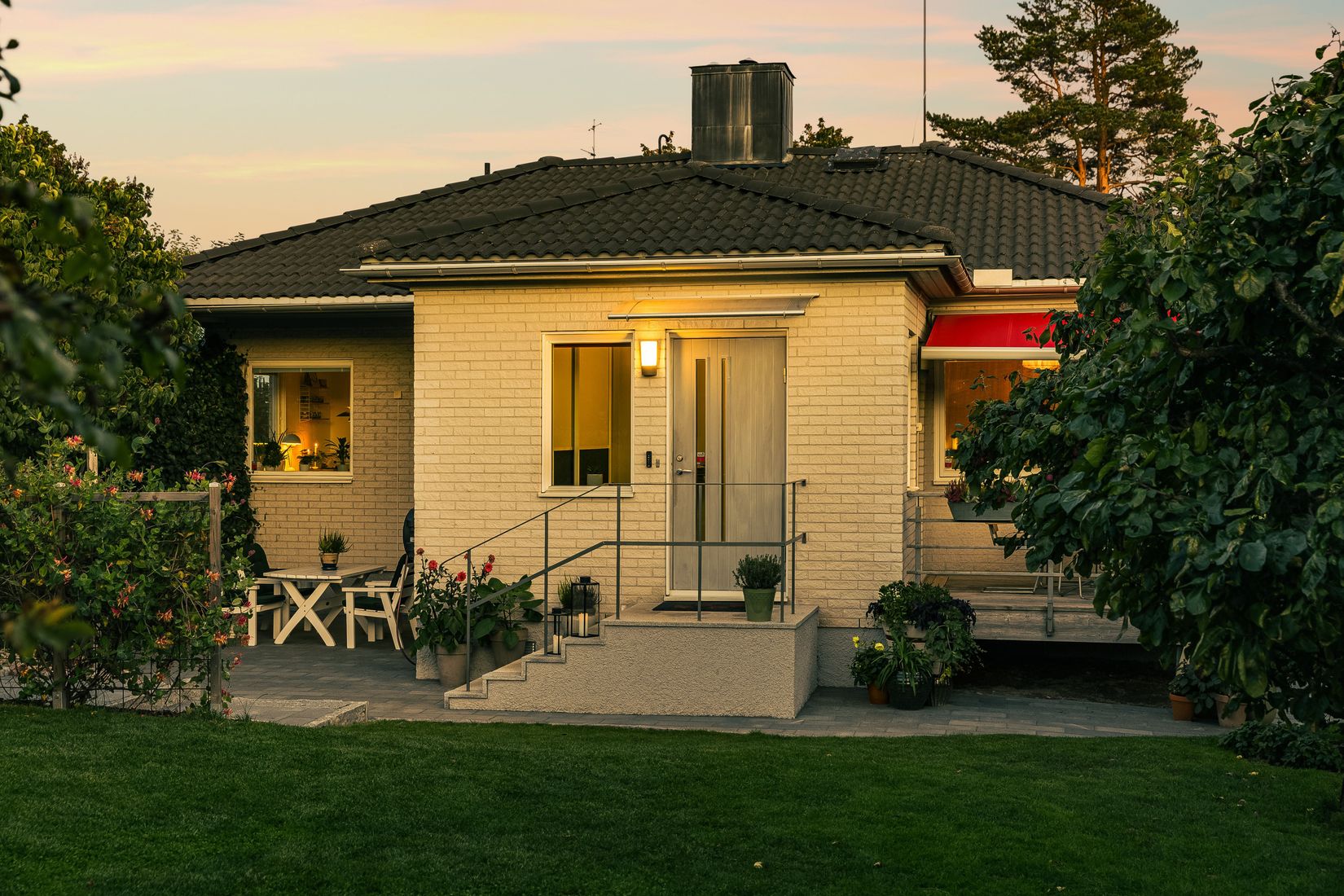 Trädgården vilar grön och inbjudande kring huset, med generösa ytor för barnens lek, middagar under bar himmel eller stilla stunder i skuggan av fruktträden. Hörntomten skänker både frihet och integritet, och ger möjlighet till att skapa flera egna små oaser i olika väderstreck. Här får du sol från morgon till kväll och ett hem som verkligen lever i samklang med årstiderna.