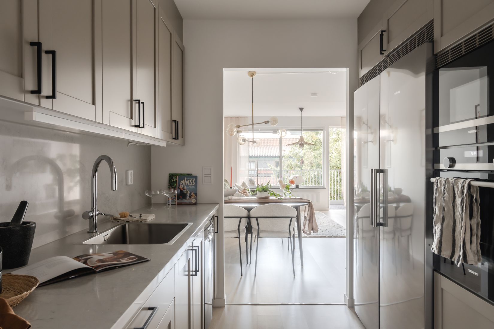 De genomgående och påkostande materialvalen gör bostaden mer unik och sticker ut från mängden. De ljusa ytskikten skapar en perfekt bas att inreda efter och sätta sin personliga prägel. De stora fönsterpartierna bidrar med mycket ljusinsläpp i varje rum. Den inglasade balkongen blir en naturlig förläggning av vardagsrummet och ett extra rum större delen utav året. Trots det mycket centrala läget kan du koppla av och njuta av lugnet och solen som gör dig sällskap till sena kvällen. Kök från Vedum med tidlös design och full maskinell utrustning. Bostaden är registrerad som en 2:a men är byggd som en 3:a idag. Är man inte i behov av det andra sovrummet kan med enkelhet ta ner väggen mot köket för att öppna upp planlösning och få en trevlig plats för matbordet. Badrum i vitt marmormönstrat kakel och klinkers. Det finns en praktisk tvättavdelning utrustad med både tvättmaskin, torktumlare, arbetsbänk och vägghängda förvaringsskåp vilket bidrar till en bekväm vardag. Till lägenheten hör ett källarförråd. Hissen i huset gör det smidigt att ta sig mellan husets alla vånings- och garageplan.