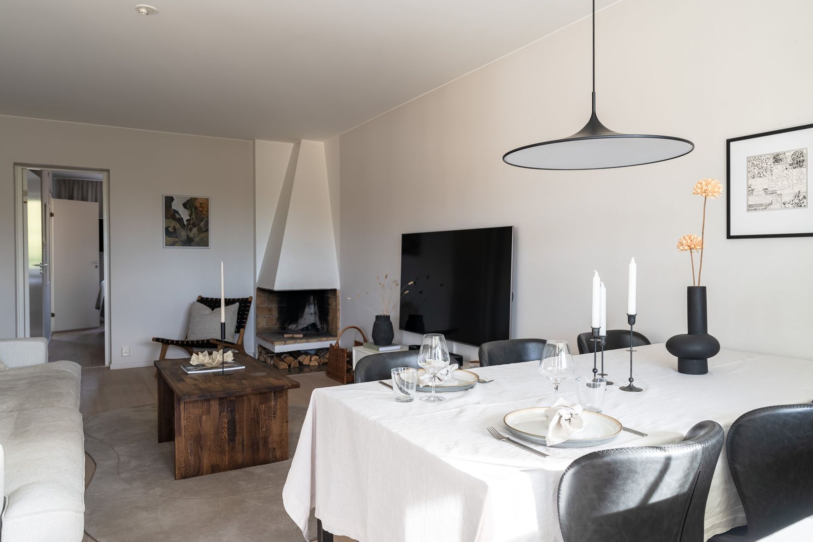 Den välplanerade planlösningen bjuder på tre rymliga sovrum, ett stilrent badrum med kakel och klinker samt en gäst-WC. Hjärtat i bostaden är det generösa vardagsrummet som badar i ljus tack vare stora fönsterpartier och som enkelt rymmer både soffgrupp och matsalsdel. Här finns även den vackra öppna spisen som ger en extra dos trivsel under årets kallare dagar.