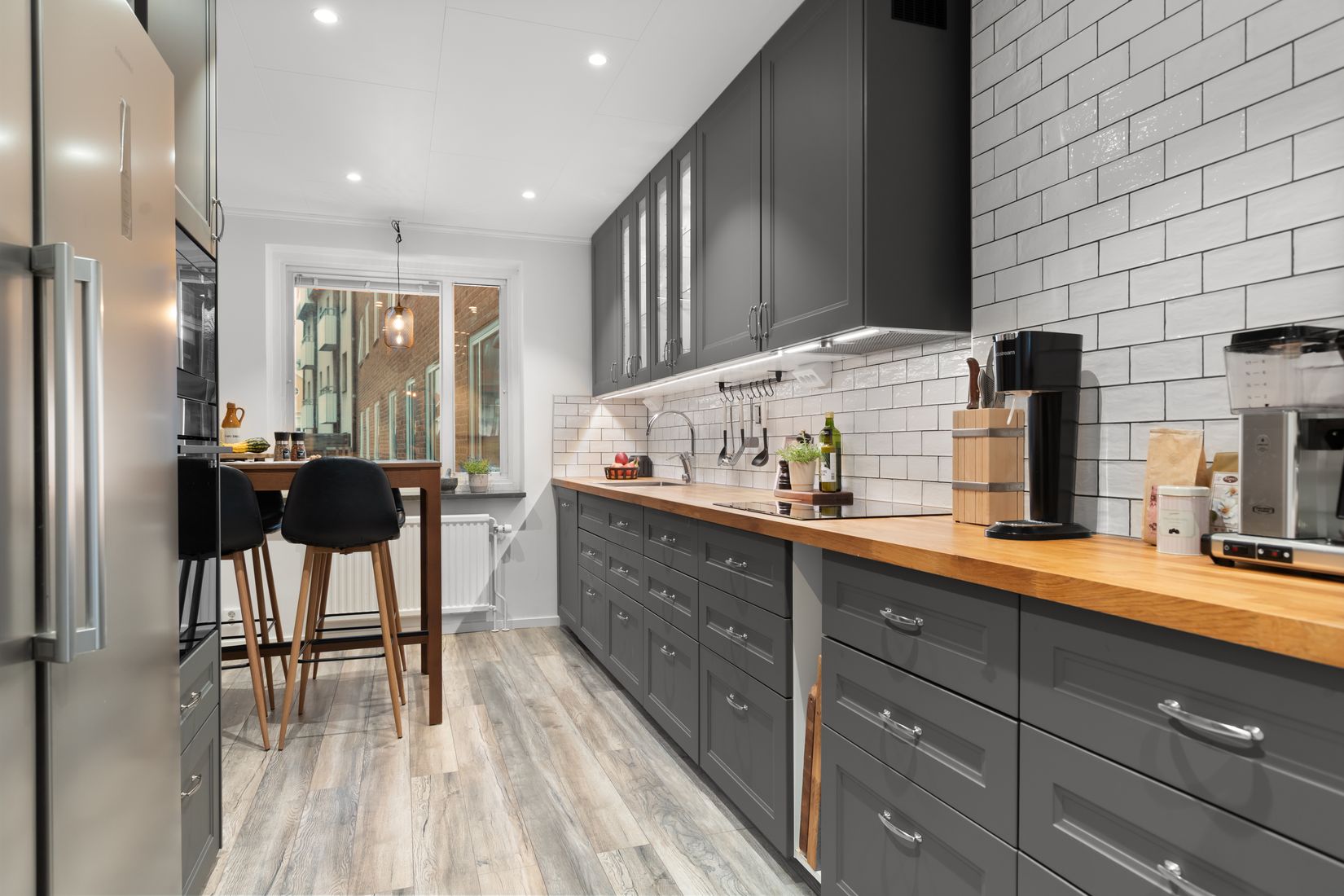Lägenheten totalrenoverades 2022 och erbjuder ett stilrent kök i grått med bänkskivor i ek. Ljusa färger och nya laminatgolv samt spotlights i alla rum skapar en modern och trivsam känsla. De två generösa sovrummen ger gott om plats för både familj, gäster eller hemmakontor. Här finns också gott om förvaring. Badrummet är helkaklat och fräscht, och den separata WC:n renoverades i samband med föreningens stambyte.