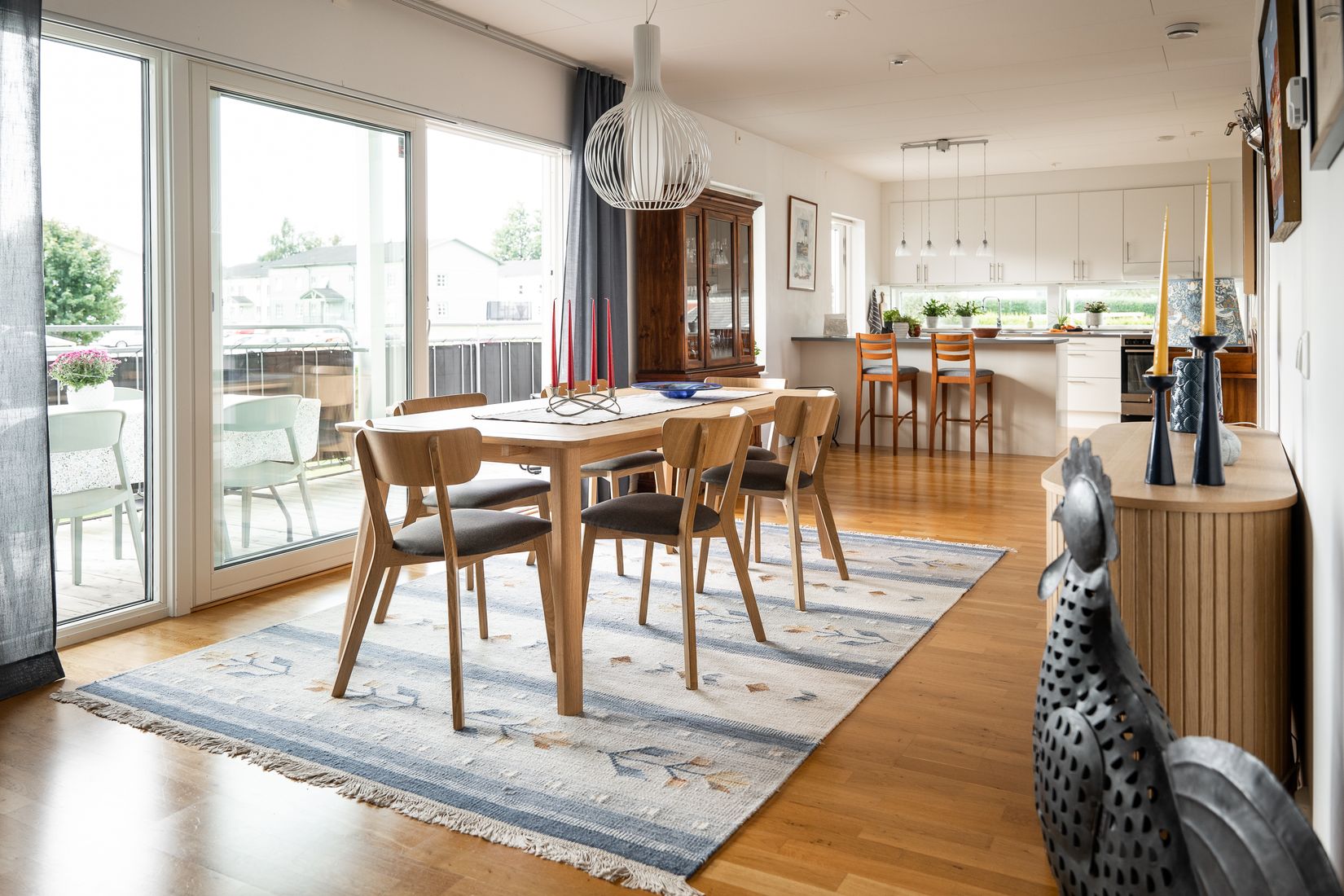 Redan i hallen möts du av en välkomnande atmosfär med gott om plats för ytterkläder. Vardagsrummet bjuder på stora fönsterpartier som låter ljuset flöda in och skapar en härlig rymd. Här finns plats för både soffhörna och umgänge, och den öppna planlösningen mot köket gör detta till hemmets självklara samlingspunkt. Köket är i sin tur stort och socialt, med generösa arbetsytor, släta skåpsluckor och plats för ett rejält matbord – perfekt för både familjemiddagar och festligare tillställningar.