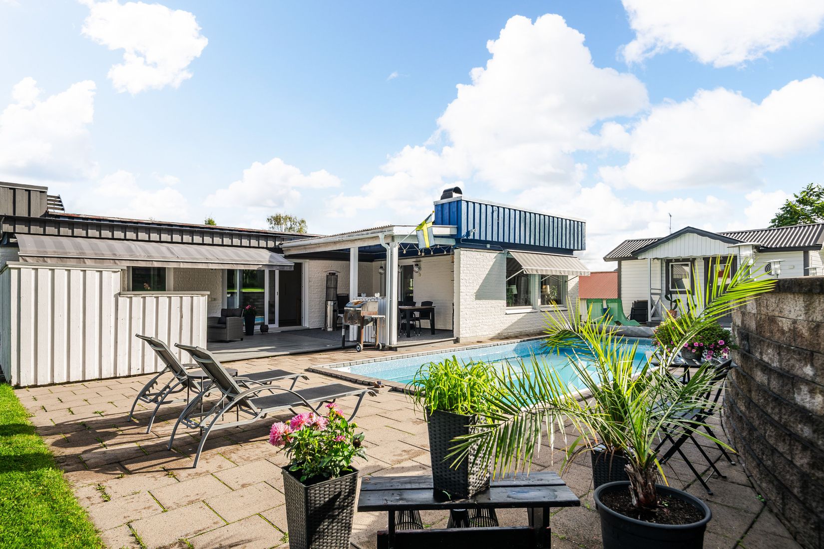 Bostaden har en genomtänkt planlösning med fokus på sociala ytor och funktionalitet. Det stilrena köket går i sobert grått och erbjuder generösa arbetsytor, rikligt med förvaring, integrerad vinkyl och en trevlig bardel mot matrummet. Intill ligger det rymliga vardagsrummet/matrummet med dess stora fönsterpartier, vacker kamin och utgång till den insynsskyddade baksidan. Här väntar en riktig sommardröm – med trädgård, pool och ett stort altandäck som bjuder in till lata dagar i solen eller härliga grillkvällar. Tomten är väl insynsskyddad och ger en privat bas. På detta bostadsplan finns även tv-rum, två sovrum samt bra med förvaringsmöjligheter.