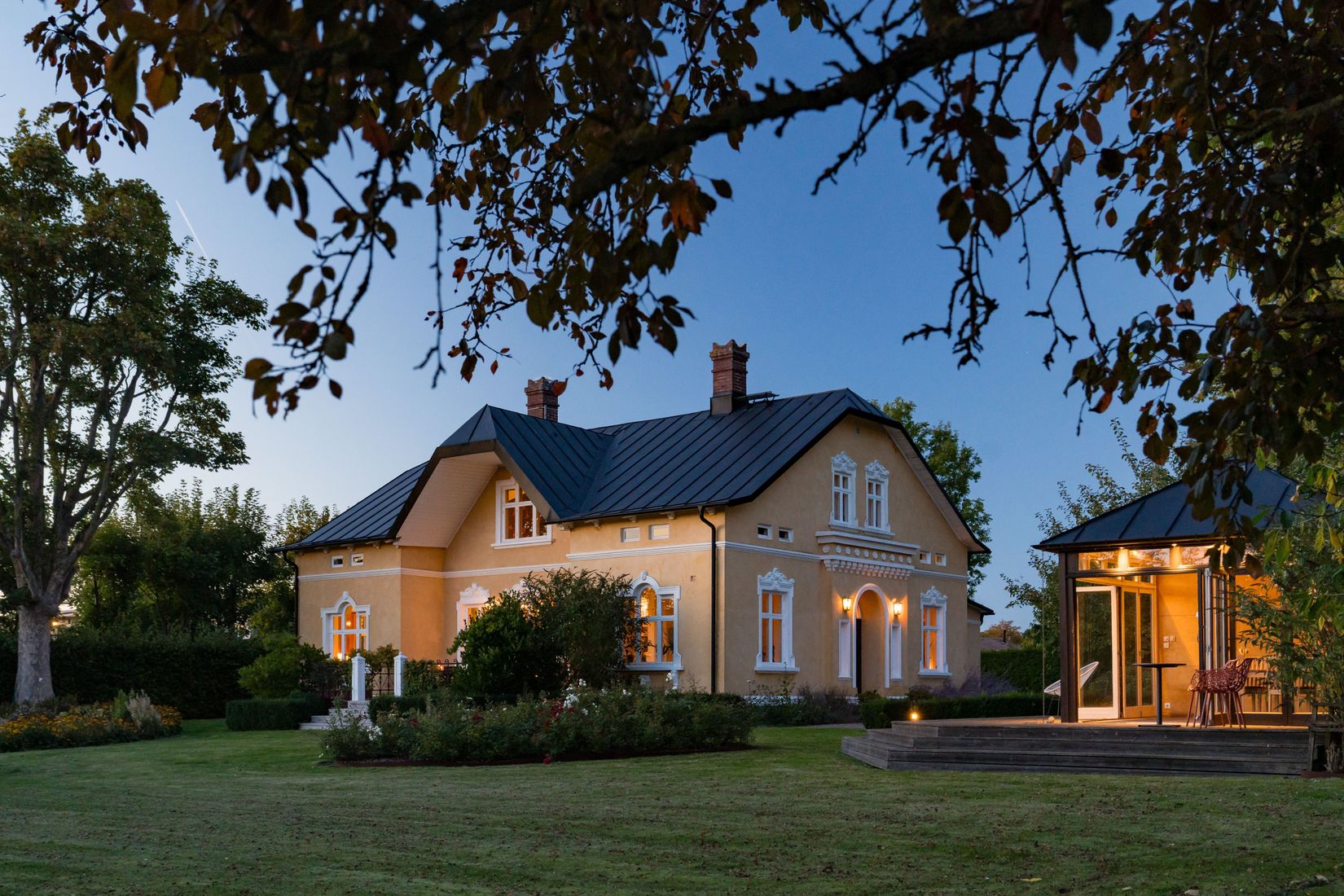 Redan vid ankomsten till den generösa tomten på hela 3 729 kvm infinner sig känslan av att stiga in i en herrgårdsmiljö. En grönskande allé leder fram till den pampiga huvudingången, där de maffiga ekdörrarna välkomnar dig in i den historiska byggnaden.