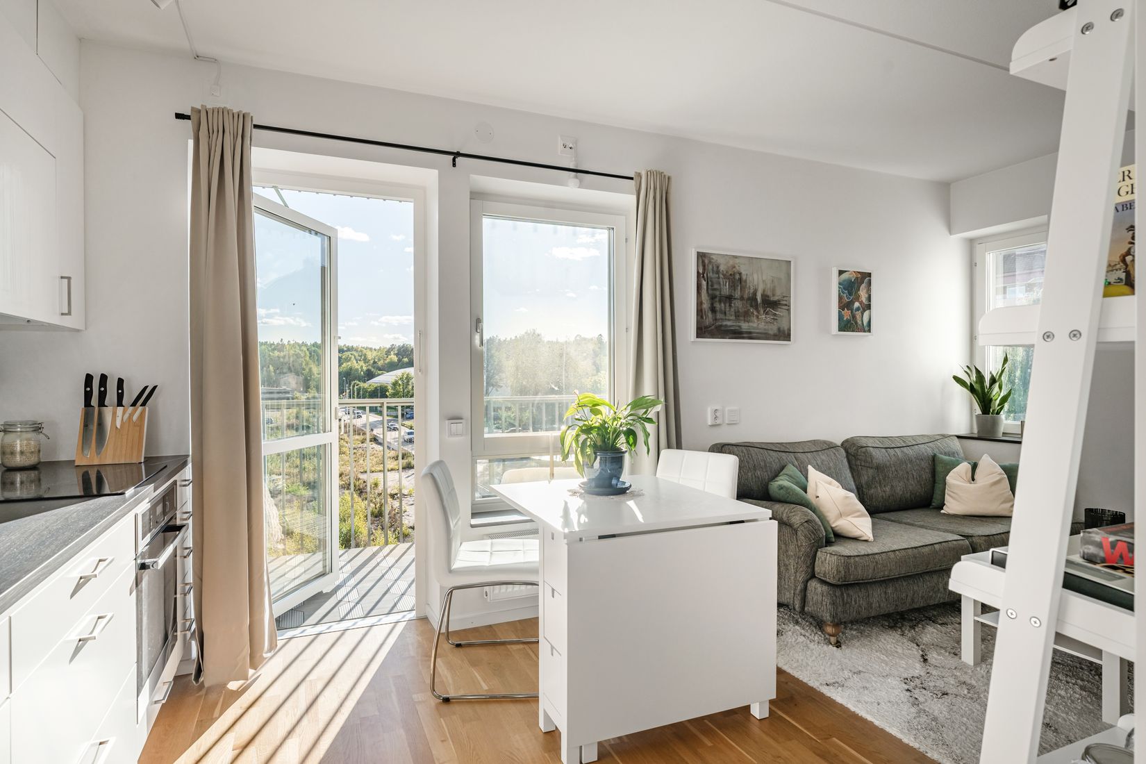 I det luftiga vardagsrummet strömmar ljuset in från de stora fönstren. Här finns gott om plats för både soffgrupp och arbetsplats, tack vare den smarta loftsängen som frigör golvyta och gör rummet både mysigt och flexibelt att inreda. Köket är modernt utrustat och erbjuder bra arbetsytor samt plats för matbord.