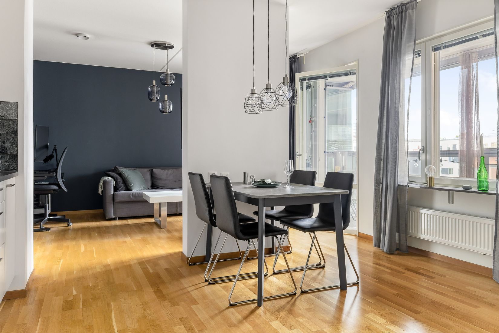Från den rymliga balkongen i sydostläge har ni en härlig utsikt över innergården och Annedals taklandskap. Här kan ni njuta av solen från tidig morgon fram till eftermiddagen. Lägenheten har generösa fönsterpartier som skapar ett fint ljusinsläpp och är smakfullt inredd med harmoniska färger och enhetliga materialval. Planlösningen är väl genomtänkt med en halvöppen planlösning mellan kök och vardagsrum vilket bidrar till att detta är en väldigt social lägenhet. Sovrummet är väl utformat och rymmer gott om förvaring och en fin utsikt. Helkaklat och fräscht badrum utrustat med både tvättmaskin och torktumlare.