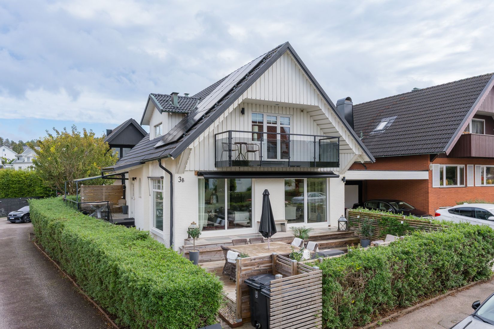 På övre plan finns master bedroom med balkong i sydvästläge, två ytterligare sovrum och ett smakfullt helkaklat badrum. Källaren erbjuder extra utrymme för hobby, gäster eller tonåring, tillsammans med duschrum, tvättstuga och gott om förvaring.