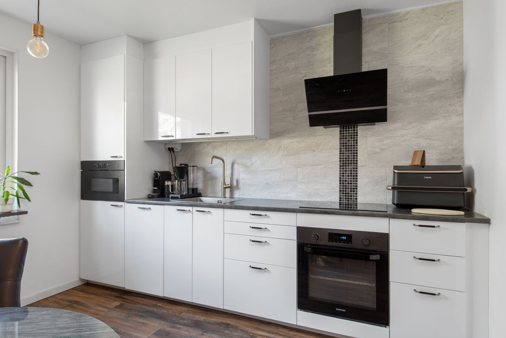 Köket är både funktionellt och elegant, med fina materialval, gott om arbetsytor och smarta förvaringslösningar, perfekt för både vardagsmiddagar och sociala kvällar. Sovrummet rymmer enkelt en större säng och lämnar utrymme för personlig inredning. Här finns också en praktisk klädkammare som ger dig extra generösa förvaringsmöjligheter. Hemmet erbjuder genomgående ljusa ytskikt och ett högkvalitativt vinylgolv.
