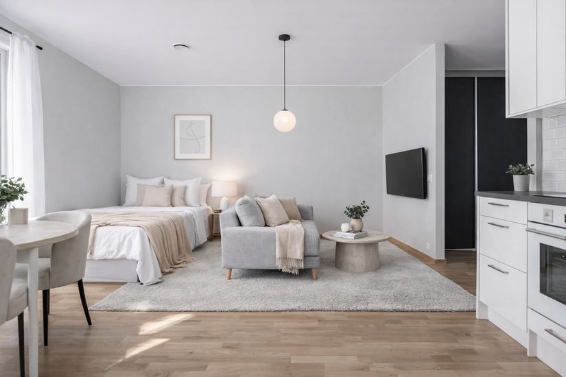 Allrummet ger gott om plats för både köksbord, soffa, säng och mer förvaring. I den inbjudande hallen finns generösa förvaringslösningar, praktiska avhängningsytor och plats för ytterligare möbelpjäs.
