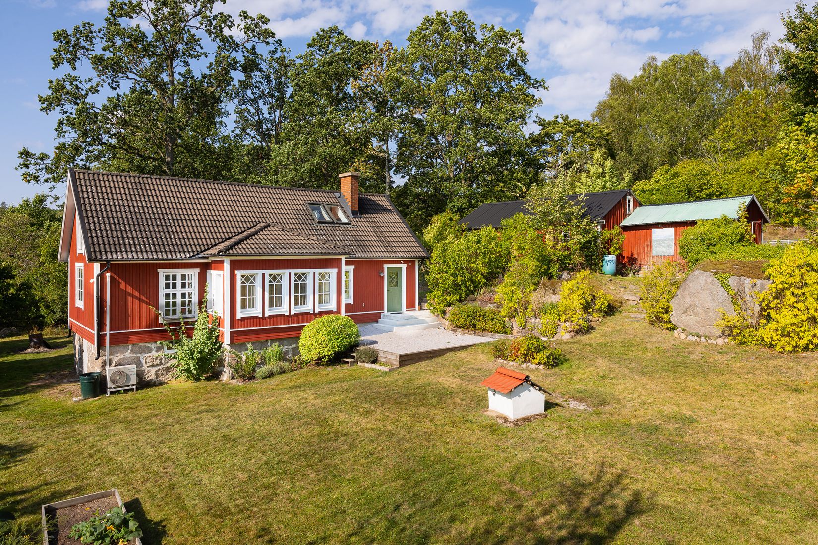 Huset är ett vackert rött trähus med vita knutar, inbäddat i grönskande natur. Här möts du av en välskött trädgård med gott om plats för både odling och avkoppling. Den generösa altanen i soligt läge blir en naturlig samlingspunkt för familj och vänner.