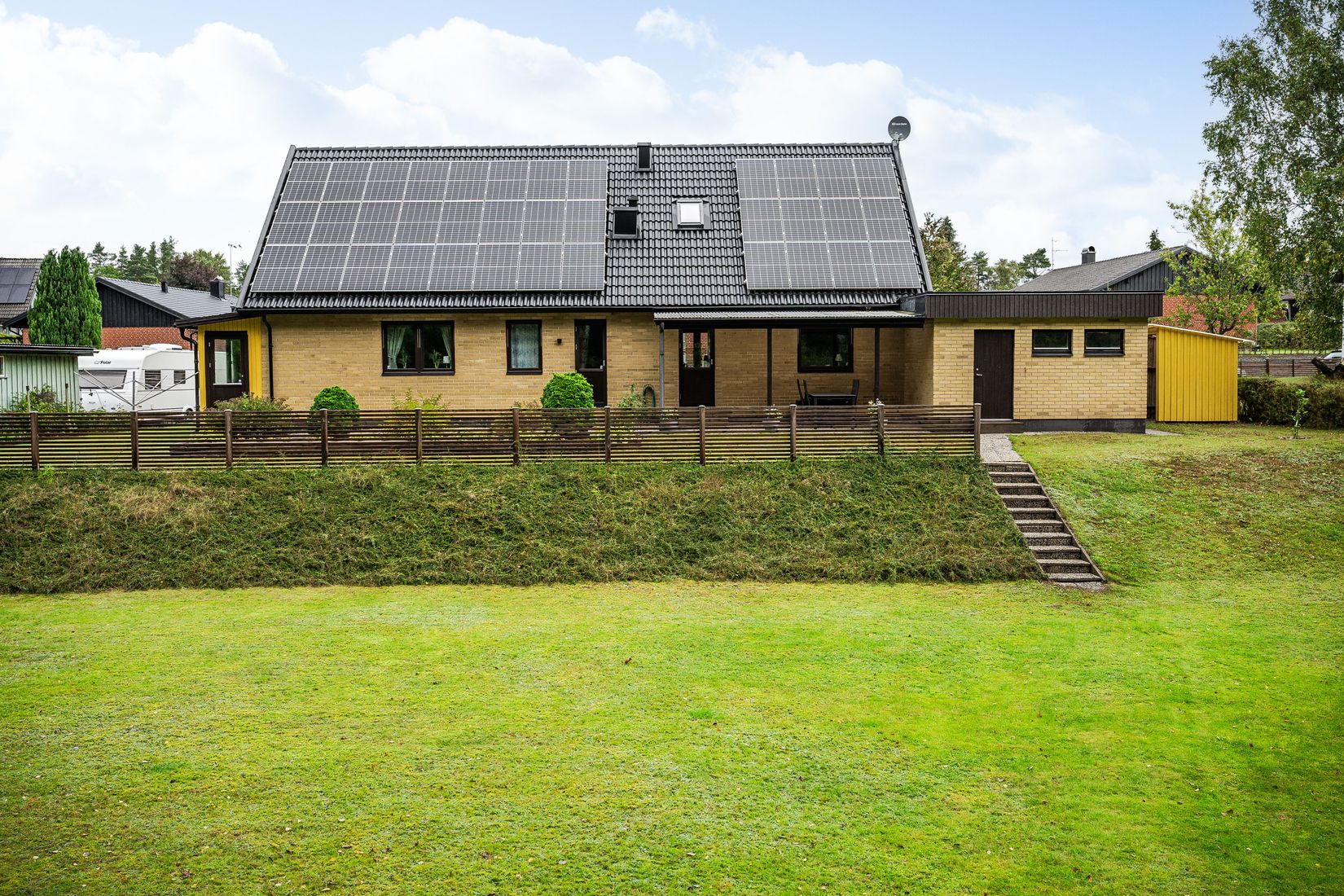 Den sluttande tomten på baksidan vetter mot söder och gränsar direkt till skog med motionsslingor – en oas för både avkoppling och aktivitet. Här bor du med naturen som granne och ändå nära Tyringes service.