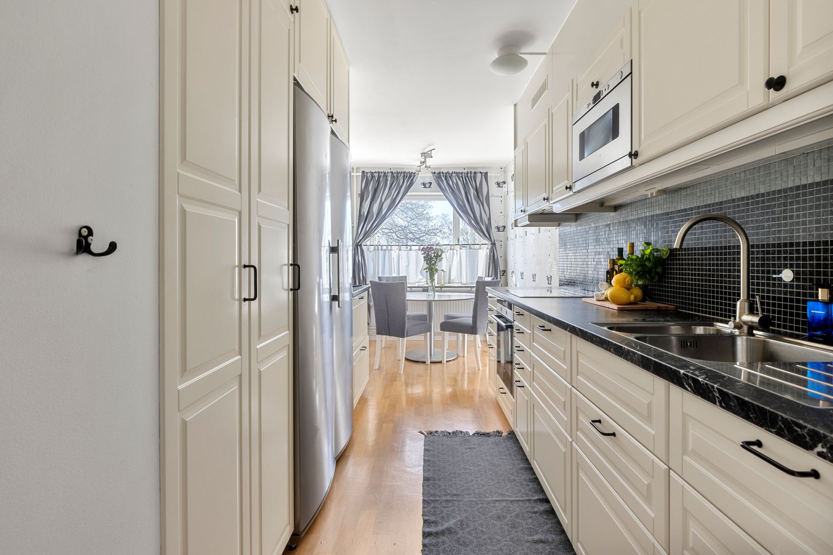 Vidare in i bostaden möts du av det dubbelsidiga köket med goda arbetsytor och förvaringsmöjligheter via vita köksluckor. Här får ni även plats med ett matbord för 6 personer. Lättmöblerat vardagsrum där du får plats med större soffgrupp, tv-bänk, bord och annat möblemang. Härligt med ljusinsläpp via de väl tilltagna fönsterpartierna i ett fritt läge med grönskande utsikt och en inglasad balkong som erbjuder eftermiddagssol!