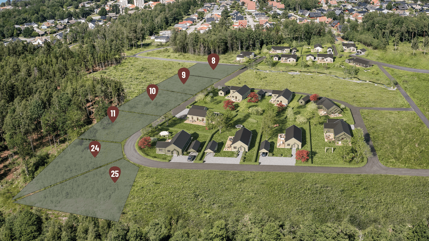 De två första tomterna bjuder på extra livskvalitet med en naturskön damm och en inbjudande grillplats precis bakom. Tomterna i mitten är plana och lättbyggda – en dröm för den som vill komma igång snabbt med sitt nya hem. För dig som söker det lilla extra finns de två större tomterna i sydvästläge, där du får möjlighet till både rymlighet och en fantastisk utsikt.