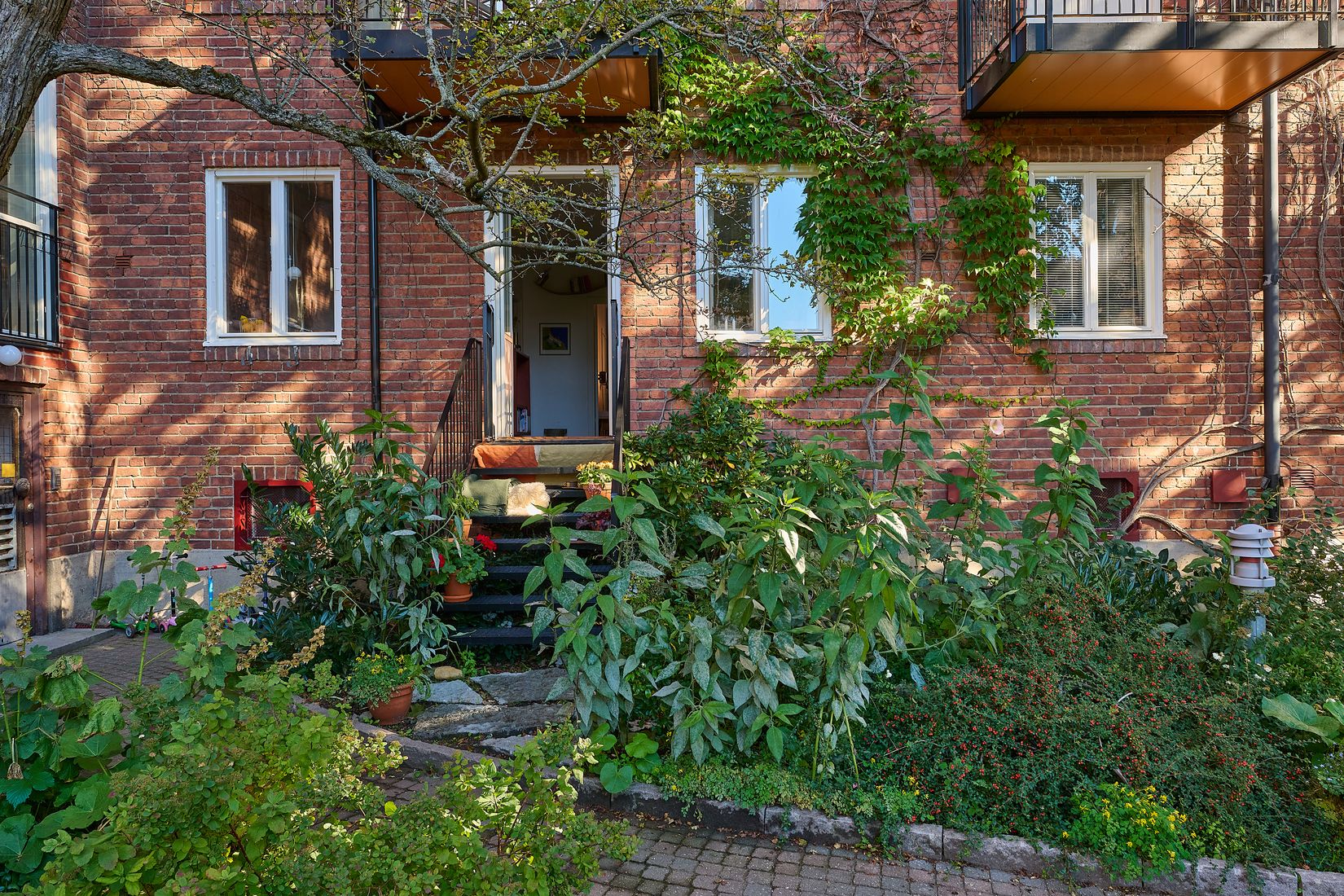 Välplanerad trea med stort öppet kök och vardagsrum med glasad pardörr ut till trappan och föreningens gemensamma trädgård där man njuter kvällssolen och gårdslugn mitt i stan. Planlösningen är genomgående med originalfönster mot öst och väst. Skicket är väldigt gott och lägenheten har renoverats löpande under de senaste åren. Genomgående gedigna material har använts, så som golv av hyvlad jämtländsk kalksten breda långa brädor av douglasgran utan trösklar. Gammaldags charm och tidlösa materialval samsas på ett tilltalande sätt.