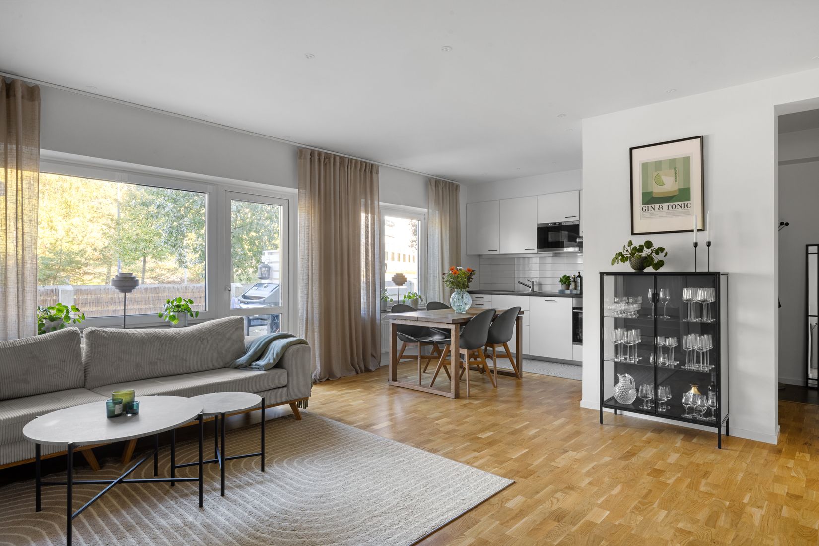Den öppna planlösningen mellan kök, matplats och vardagsrum skapar ett socialt och luftigt hem där stora fönster och altandörren mot uteplatsen blir naturliga blickfång.