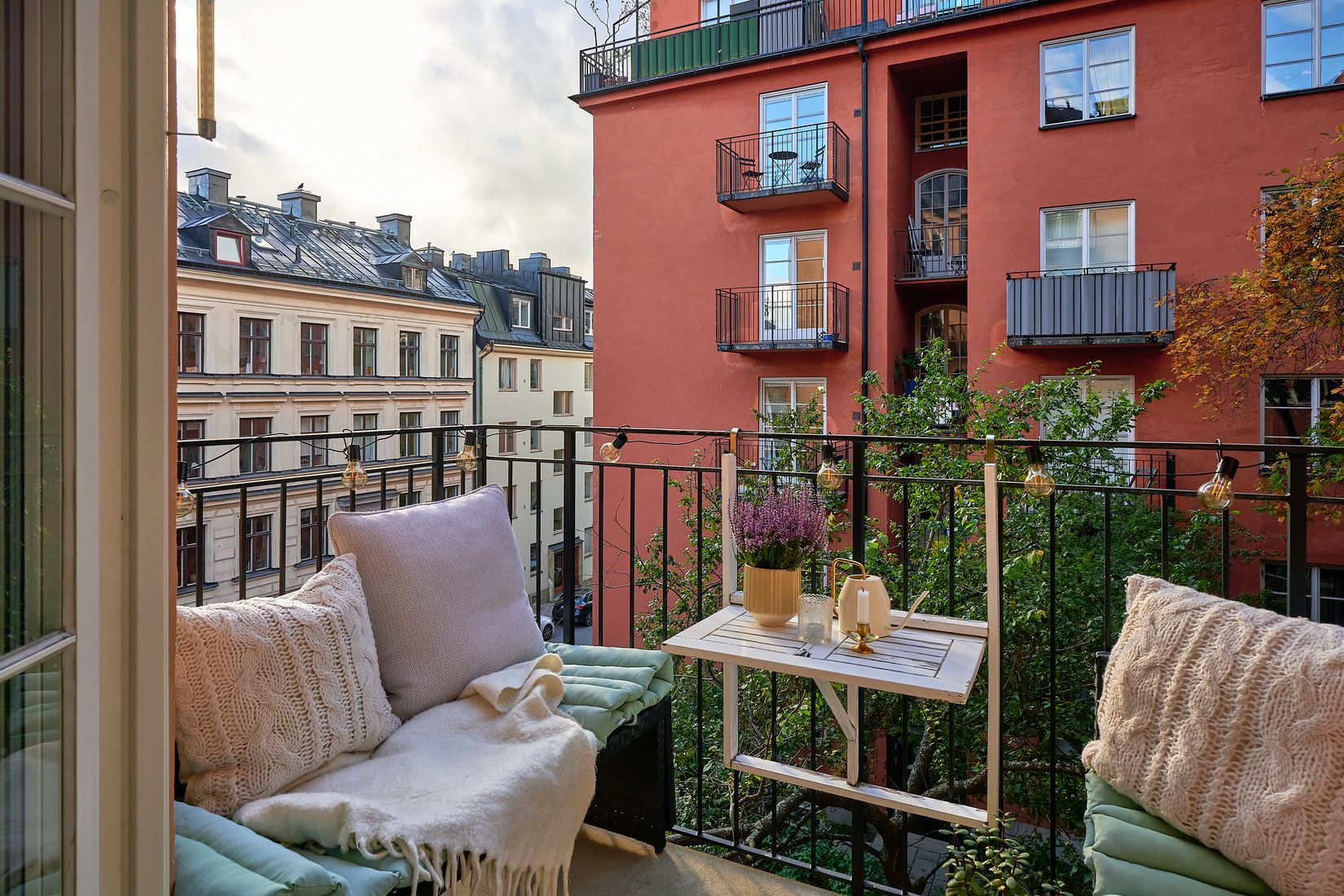 Det stora rummet rymmer både säng, soffa och matplats utan att kompromissa med rymden. Via vackra pardörrar i glas kliver du ut på den privata balkongen där solen ligger på från lunch och framåt. Köket är yteffektivt med bra förvaring och arbetsyta, och det fräscha badrummet är utrustat med tvättmaskin. Därtill finns en praktisk klädkammare som förenklar vardagen.