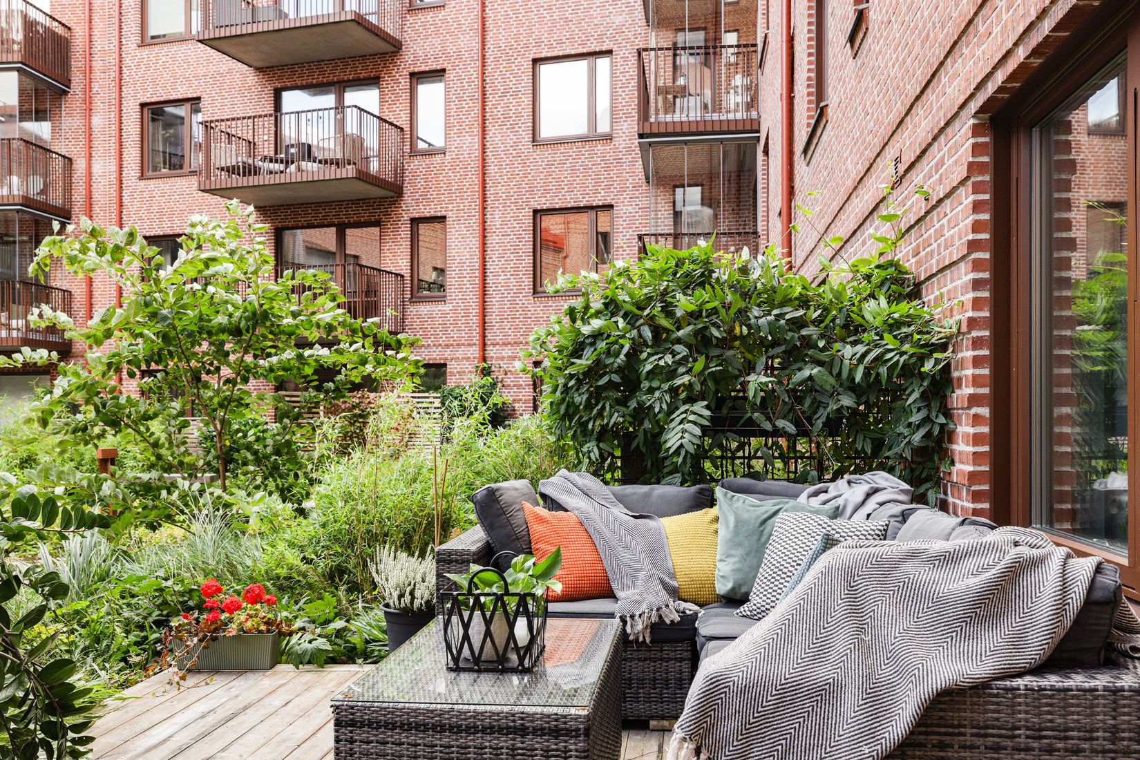 Den smarta planlösningen ger ett rymligt vardagsrum med gott om plats för både soffa och annat möblemang. Från bostaden når du två uteplatser i olika väderstreck – där den ena har ett soligt läge under eftermiddag och kväll, perfekt för lata sommardagar eller en middag i kvällssolen. Den andra uteplatsen erbjuder en sval och skyddad plats, idealisk för varma dagar då du söker skugga eller en lugn stund med en bok.