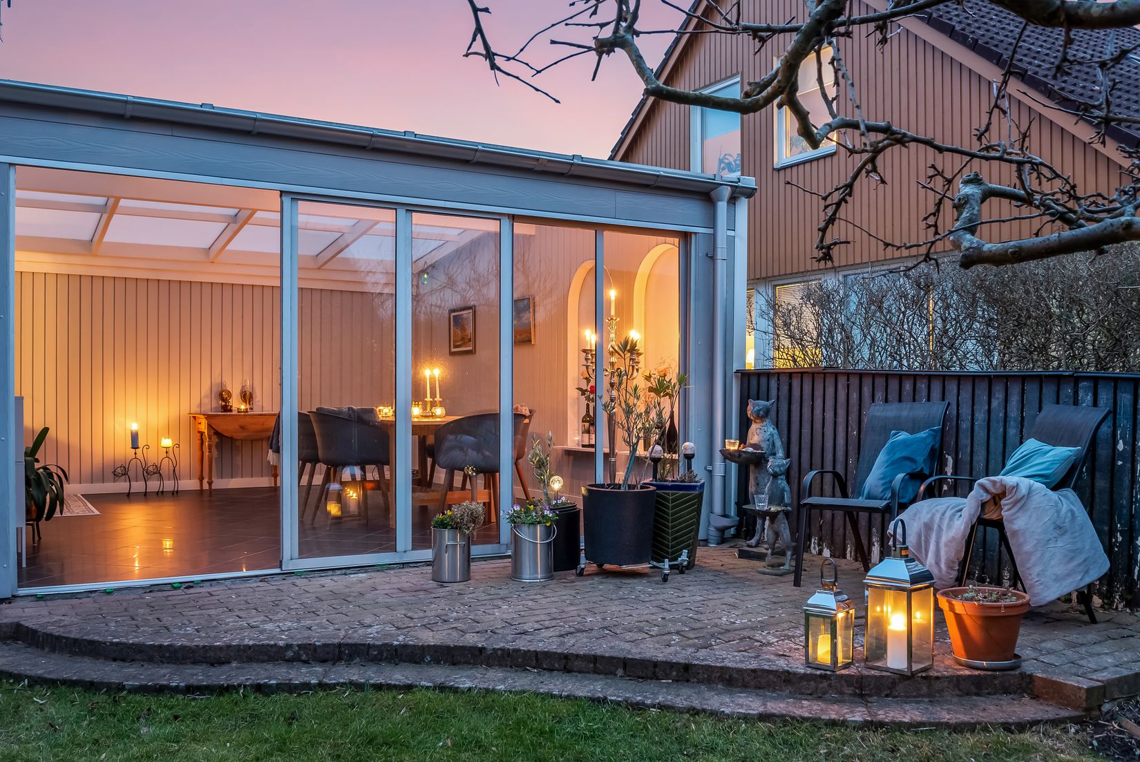 Från allrummet nås det fantastiska uterummet, en riktig förlängning av boendet och en självklar plats att njuta av från tidig vår till sen höst. Här flödar ljuset fritt, med trädgårdens grönska alldeles utanför.