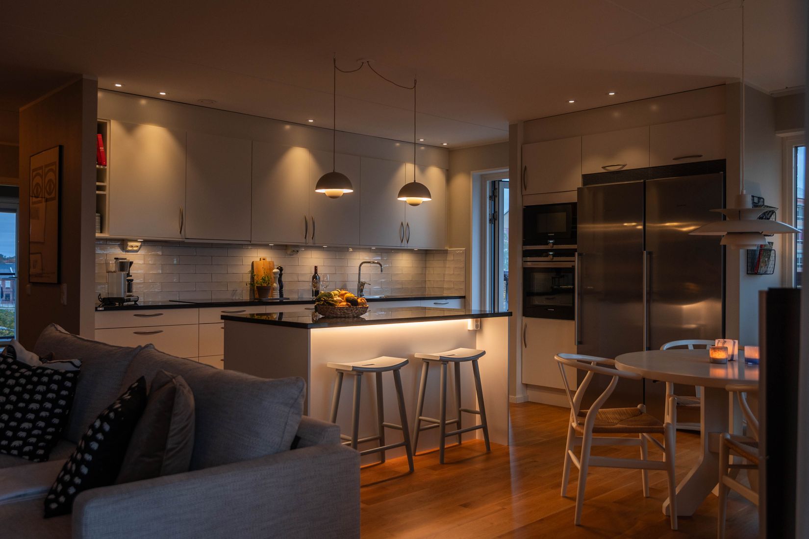 Bostaden är smakfullt inredd med högkvalitativa material och har ett påkostat och modernt Marbodalkök med släta luckor och överskåp och en väl tilltagen köksö. Dessutom finns det två badrum med kakel och klinker. De tre sovrummen har olika karaktär för att passa familjemedlemmar i olika åldrar. Mycket generösa förvaringsmöjligheter i två klädkammare och flertalet garderober.