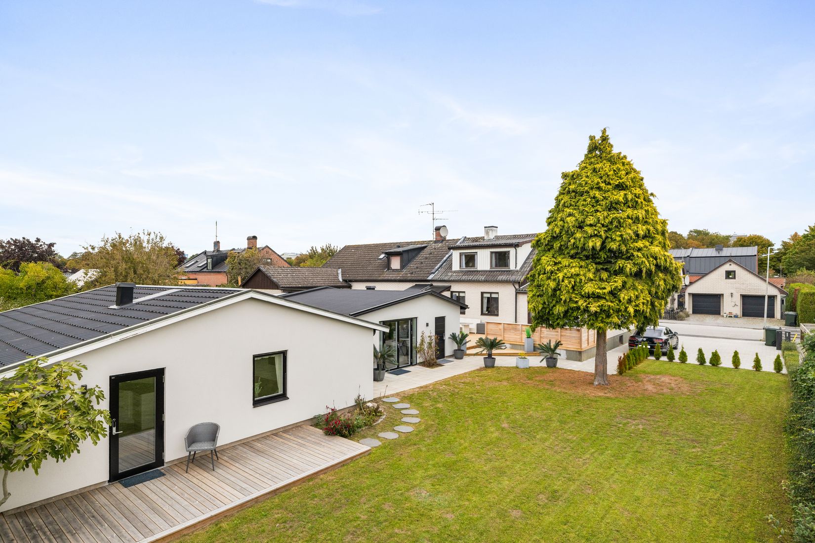 Den lummiga trädgården ramar in boendet med flera mysiga uteplatser, och på den stenlagda uppfarten finns gott om plats för bilar.