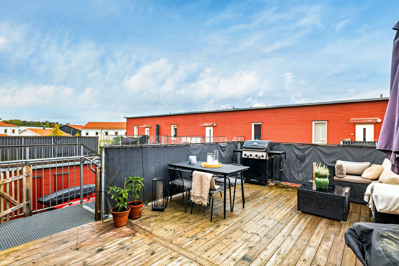 När du kliver en trappa upp till entrén når du även den generösa terrassen - en riktig pärla! Här finns gott om plats för både loungegrupp, grill och matbord, perfekt för sommarens middagar i kvällssolen.