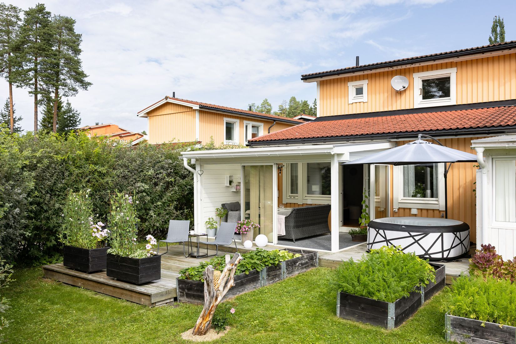 Radhusets 106 kvadratmeter disponeras på en välkomnande och luftig hall som leder vidare till ett fint renoverat kök med vita köksluckor och trevlig matplats intill stora fönster. Vidare in finner du ett stort vardagsrum med utgång till den inglasade altanen som erbjuder en plats att njuta av under stora dela av året året. Här kan du skapa din egen oas med plats för både umgänge och avkoppling. Även sovrum finns i entréplan samt badrum med dusch. Övre plan lockar med två rymliga sovrum samt rymligt badrum med badkar.