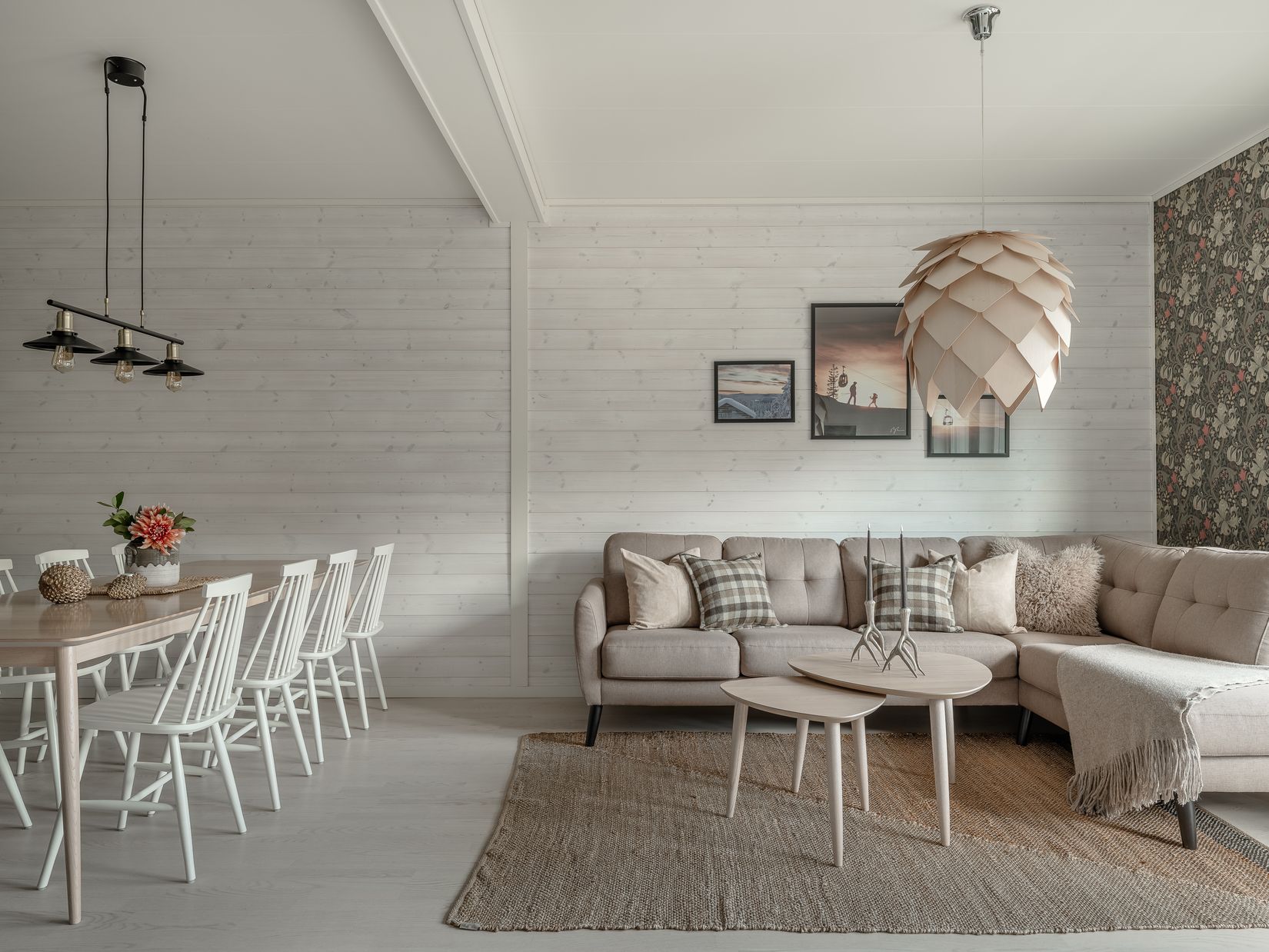 Köket från Marbodal är mörkt grått och tillsammans med den vitlaserade träpanelen och de ljusa väggarna skapas en varm kontrast och en harmonisk helhet. Från storstugan och balkongen flödar ljuset in och utsikten över pistsystemet påminner om att fjällupplevelsen väntar precis utanför. Här råder en atmosfär som är lätt att göra till sin egen men som redan idag upplevs både fräsch och välkomnande.