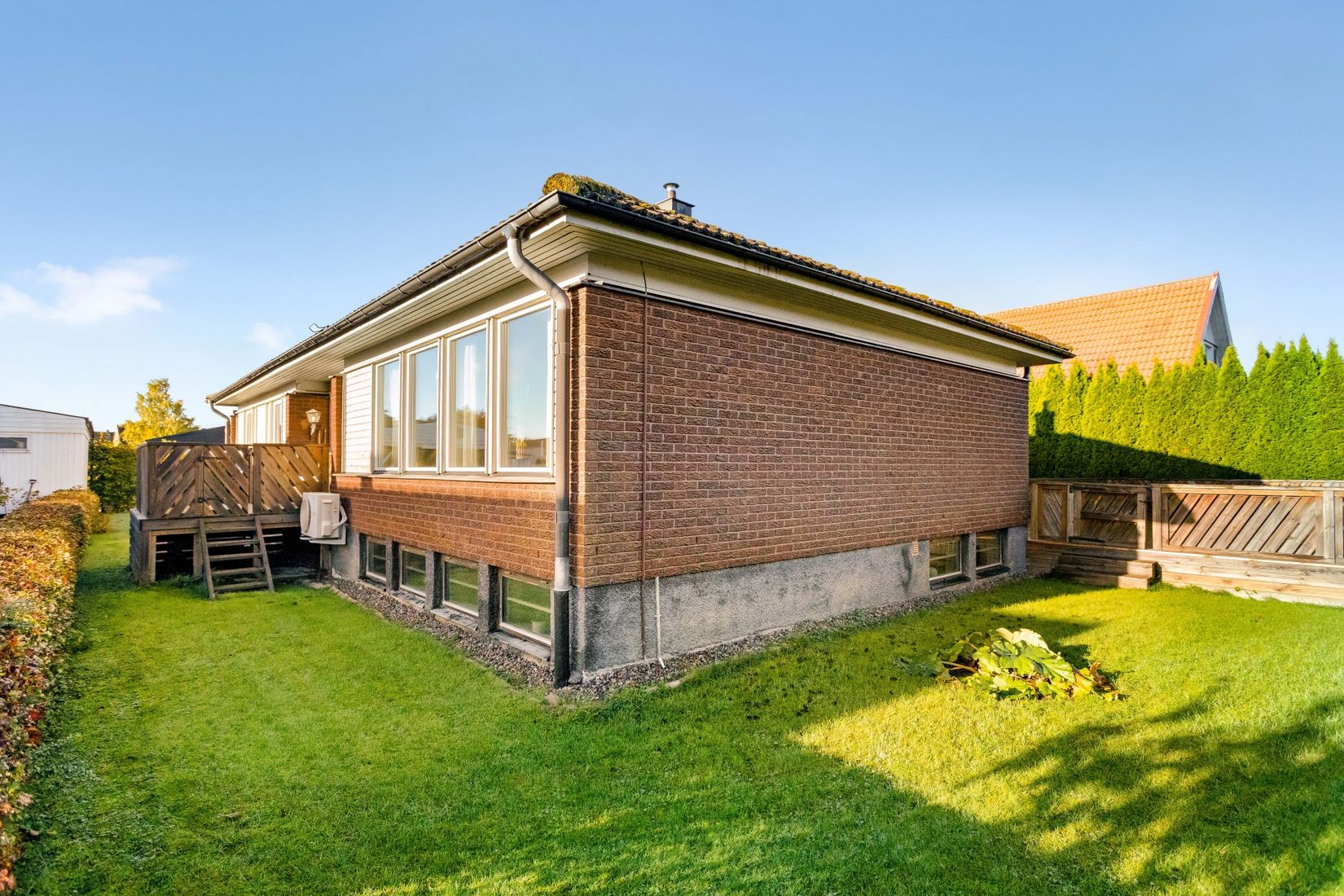 Utanför finns ett garage samt plats för ytterligare två bilar på uppfarten. Tomten är plan, lättskött och insynsskyddad - en idealisk miljö för barnens lek eller avkoppling i solen.