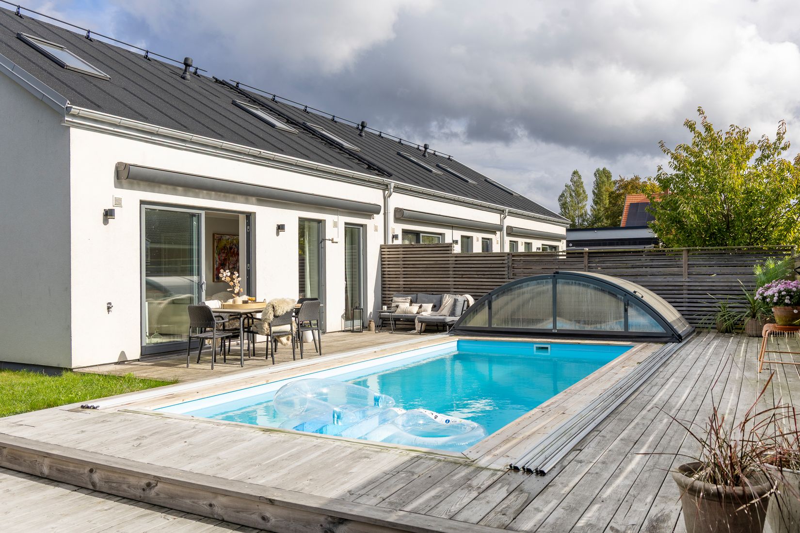 Från vardagsrummet når du det magnifika poolområdet, ett privat paradis med stort trädäck i soligt söderläge. Här väntar lata sommardagar, bad, grillkvällar och stunder av stillhet på ett lugnt och fridfullt läge.