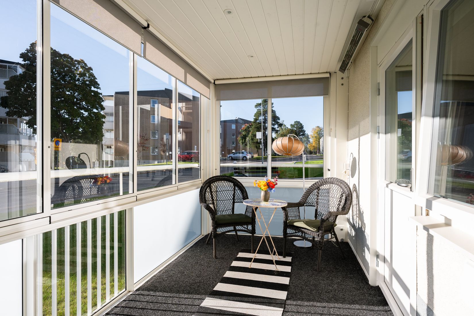 Vardagsrummet har en praktisk sovalkov samt utgång till den nya, inglasade balkongen i soligt söderläge – en perfekt plats att njuta av morgonkaffet eller kvällssolen. Genomgående parkettgolv och påkostade vitvaror ger ett exklusivt intryck.