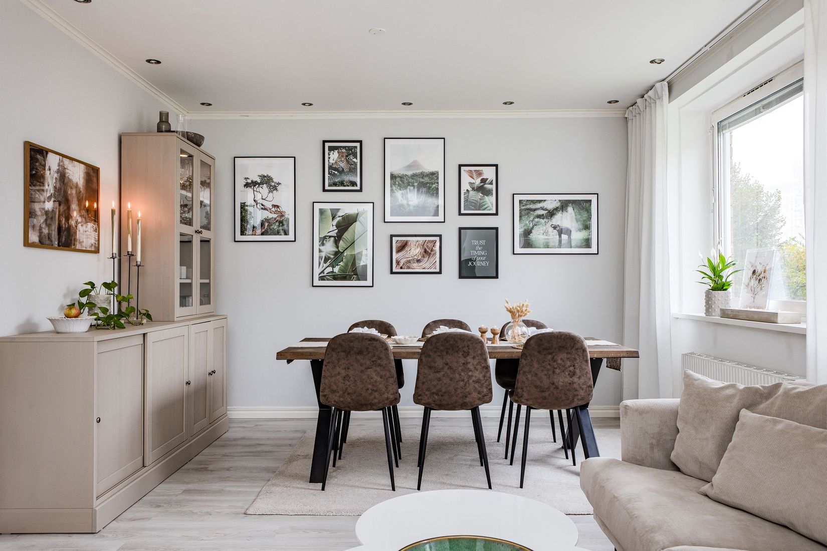 Det stilrena köket erbjuder gott om arbetsyta och plats för en matgrupp där vardagens måltider och helgens middagar får ta plats. Det rymliga vardagsrummet bjuder in till både avkoppling och sociala stunder - perfekt för filmkvällar, spelkvällar eller härliga middagar med vänner och familj.