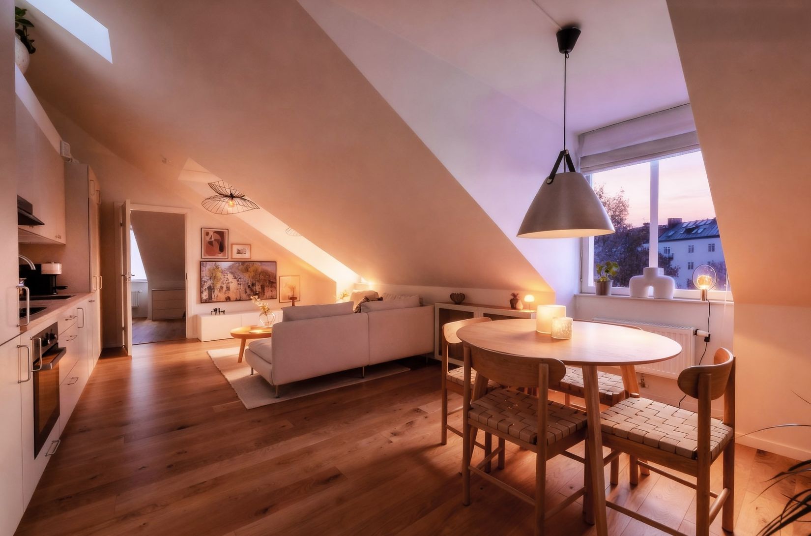 Välkommen till en nyproducerad vindsvåning i modern tappning med sober färgsättning,