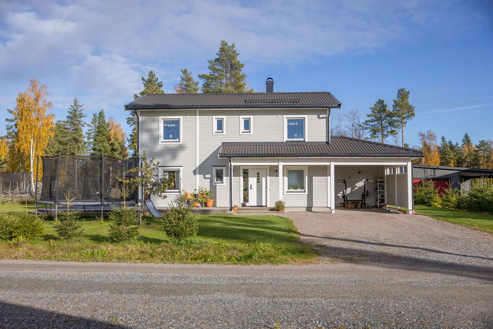 Den lättskötta tomten om 1304 kvm erbjuder fina gräsytor och en rymlig uppfart med carport och tillhörande elbilsladdare. Precis bakom huset börjar skogen, perfekt för dig som gillar skogspromenader med möjligheter att plocka kantareller, blåbär och lingon. Alldeles intill bostaden ligger en liten sjö som förvandlas till skridskobana på vintern, en riktig pärla för både barn och vuxna. Området är lugnt och trivsamt, en plats där man verkligen kan slappna av och känna sig hemma, omgiven av natur, stillhet och en varm grannsammanhållning. Ungefär en kilometer bort finns även en barnvänlig badplats med generösa gräsytor.
