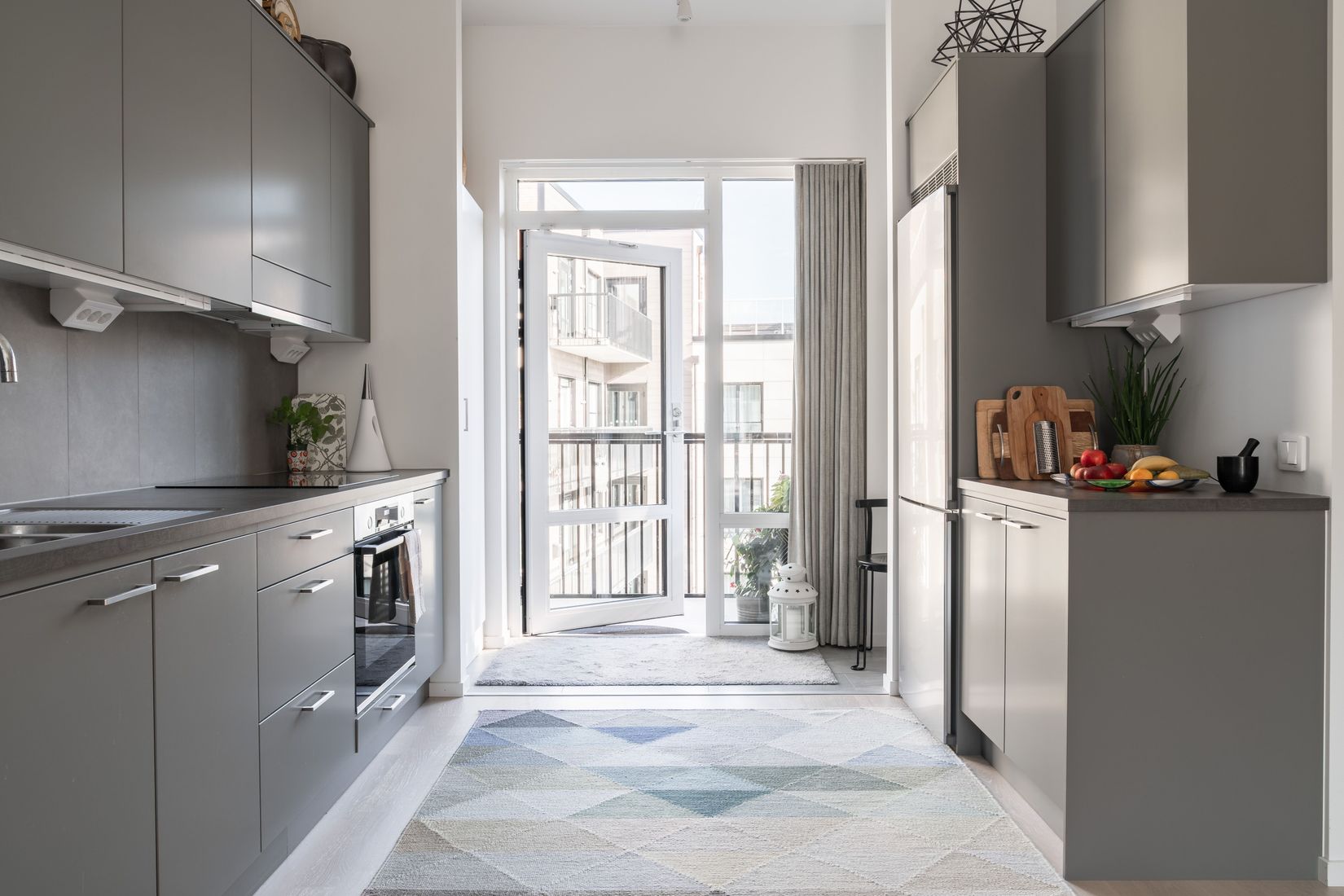 Lägenheten är belägen på fjärde våningen och nås via en loftgång. Den välkomnar med ljusa, stilrena ytor och imponerande fönsterpartier från golv till tak som släpper in rikligt med dagsljus. Den öppna planlösningen skapar en social och inbjudande atmosfär – perfekt för både vardagsliv och umgänge. Det moderna köket från Vedum, utrustat med kvalitetsmaskiner från Bosch, ligger i anslutning till vardagsrummet där det finns gott om plats för middagar och samvaro.