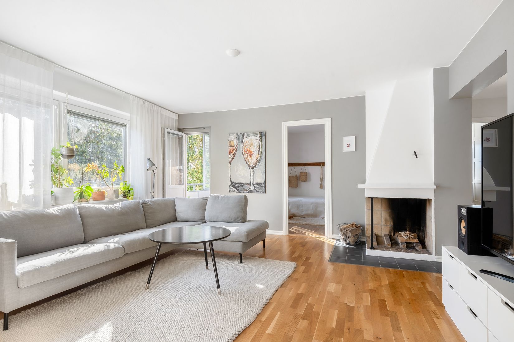 Planlösningen är väl genomtänkt med rymliga sällskapsytor som skapar utrymme för både familjeliv och umgänge. Vardagsrummet är bostadens naturliga samlingspunkt, där den vackra öppna spisen blir en självklar mittpunkt som sprider både värme och karaktär. Från vardagsrummet nås den inglasade balkongen i soligt söderläge – en extra oas som förlänger säsongen och ger plats för både avkoppling och middagar i det fria.
