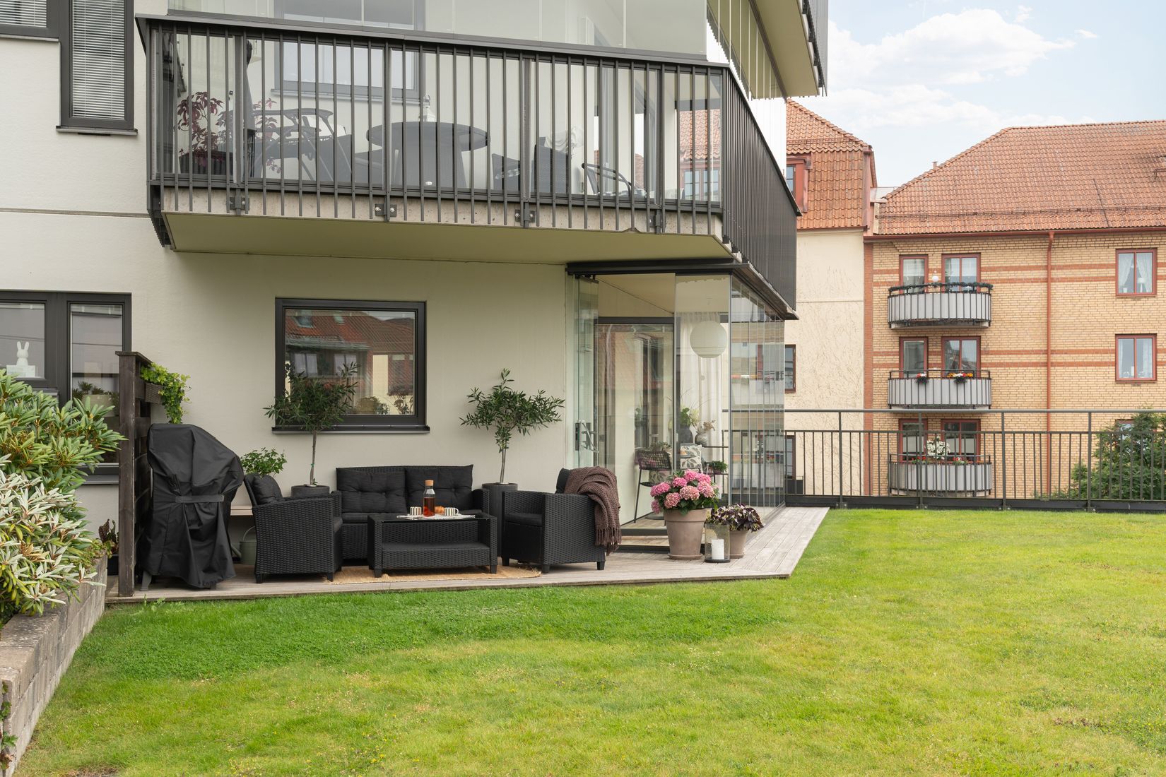 På ett mycket tilltalande våningsplan välkomnas ni till en bostad som präglas av genomtänkt design och en känsla utöver det vanliga. Här möts moderna bekvämligheter med smakfulla tillval som imponerar redan vid första steget in. Vardagsrum, matsal och kök är harmoniskt integrerade och skapar en öppen och inbjudande miljö - perfekt för både vardag och sociala sammanhang. Den generösa uteplatsen i direkt anslutning erbjuder både ett inglasat uterum och en träskodd terrass. Här binds ute- och innemiljöerna samman på ett naturligt sätt och skapar en uppskattad förlängning av bostaden som kan njutas av året runt. Planlösningen disponeras vidare över två rymliga sovrum med goda förvaringsmöjligheter, ett stilrent helkaklat badrum med tvättavdelning samt goda förvaringsmöjligheter i likväl bostaden som i förrådsutrymmet som tillhör bostaden.