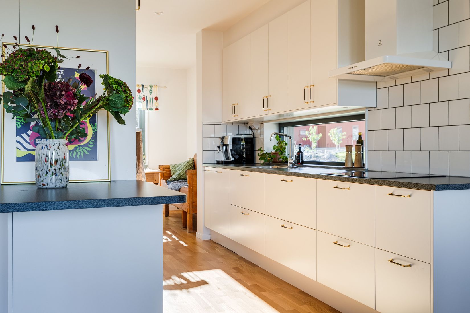 På entréplanet möts du av ett fräscht och stilrent hem där varje kvadratmeter är väl utnyttjad. Här finns ett helkaklat badrum med klinkergolv och dusch, ett separat pannrum och tvättstuga. Köket är rymligt och fullt utrustat med induktionshäll, integrerad diskmaskin, inbyggd mikro och ugn samt fullstor kyl och frys. De vita köksluckorna i kombination med den gråa bänkskivan och det vita kaklet ovan arbetsytorna skapar en stilren och modern känsla. I köksdelen finns plats för en matgrupp för cirka fyra personer, och om behovet finns går det utmärkt att dela av köket för att skapa ett extra rum eller en större hall.