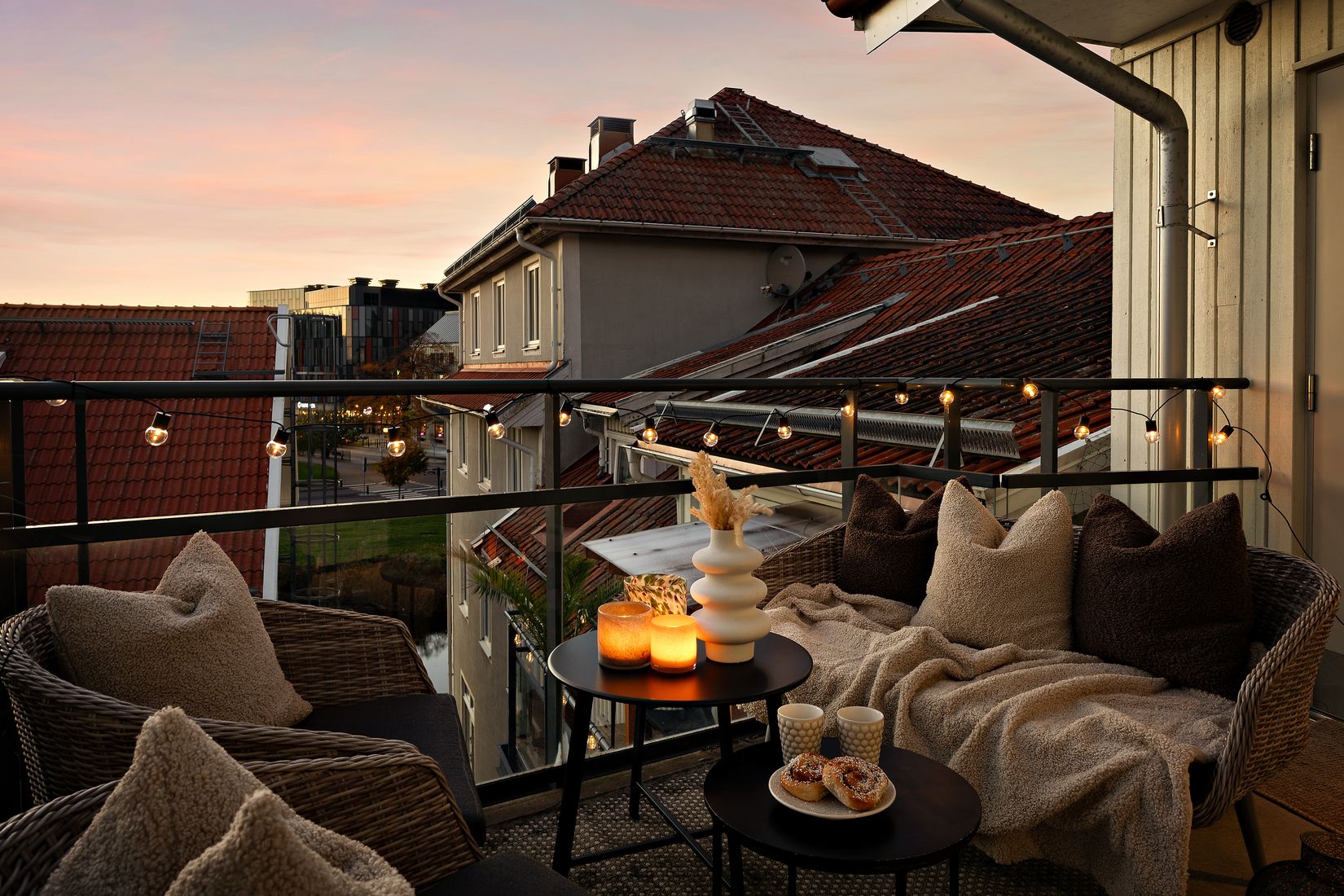 Uteplatsen i anslutning till entrén är en av lägenhetens verkliga höjdpunkter – en solig och vindskyddad plats med utsikt över ån och områdets takåsar. Här kan du njuta av eftermiddags- och kvällssolen från cirka 13 till 20, i en förvånansvärt lugn och tyst miljö – trots att du befinner dig mitt i staden.