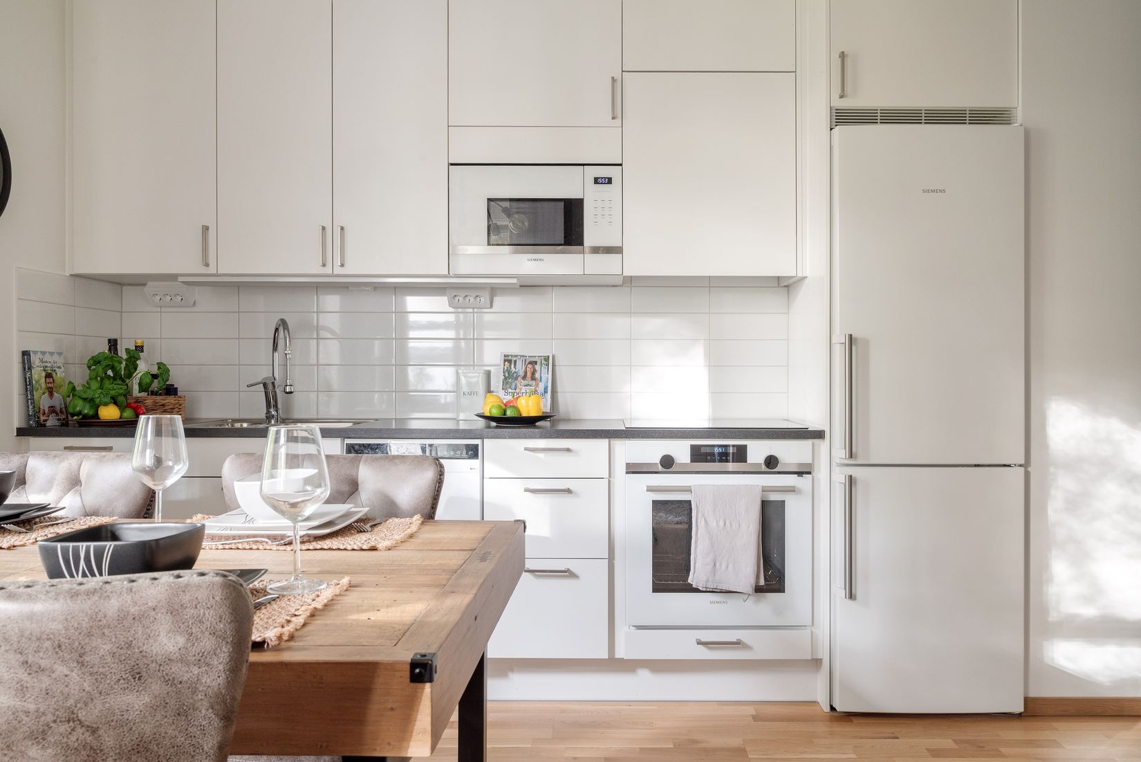Det fina köket utstrålar både funktionalitet och stil med generöst med utrymme för matlagning och umgänge. Det är en plats där vardagens kulinariska upplevelser blir till minnen för livet. Köket är öppet ut mot vardagsrummet och här når du vidare ut mot den rymliga uteplatsen i riktning sydväst. Balkongen rymmer både soffgrupp och diverse möbler.