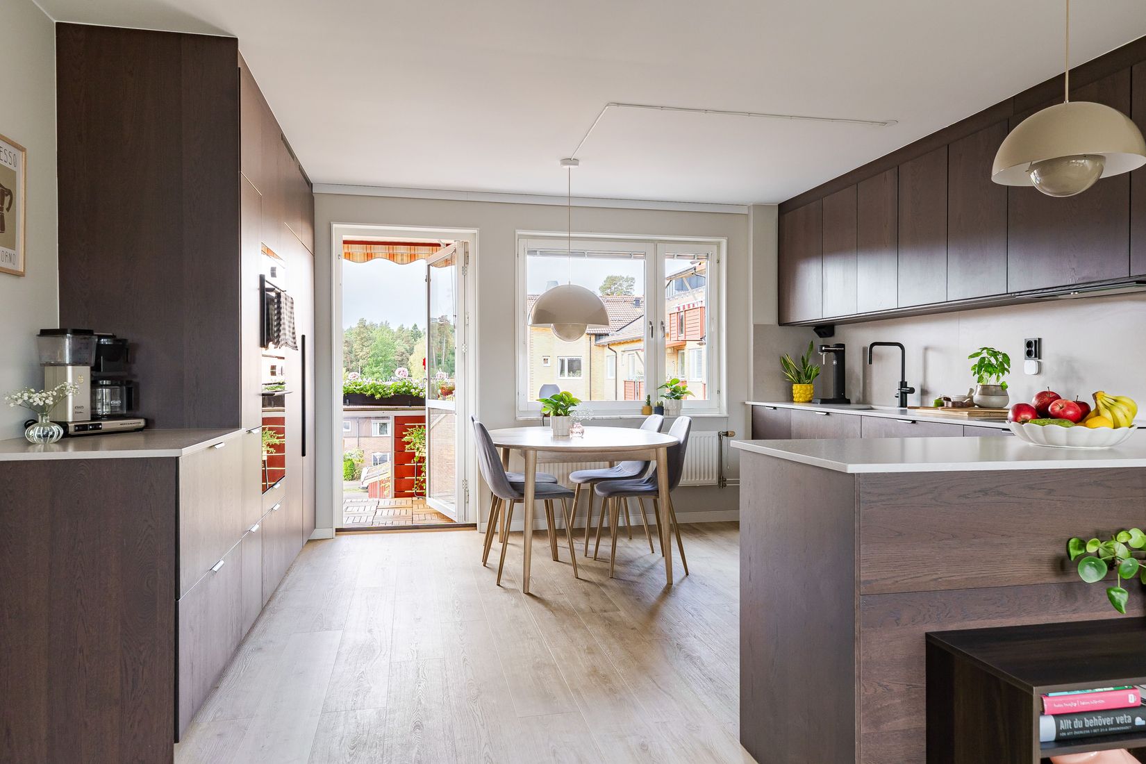 Bostaden erbjuder en genomtänkt planlösning där det sociala står i centrum. Det stilrena köket är nyrenoverat och bjuder på generösa arbetsytor, gott om förvaring och en öppen koppling med köksö mot vardagsrummet – perfekt för både vardagsliv och sociala tillställningar. Från köket kliver du rakt ut på den rymliga balkongen som vetter mot sydväst – med sol större delen av dagen och utsikt över den grönskande innergården, radhustaken och Vallaskogen i bakgrunden. En riktigt härlig plats att njuta på året om.